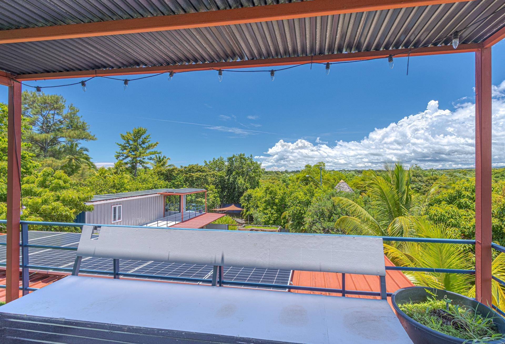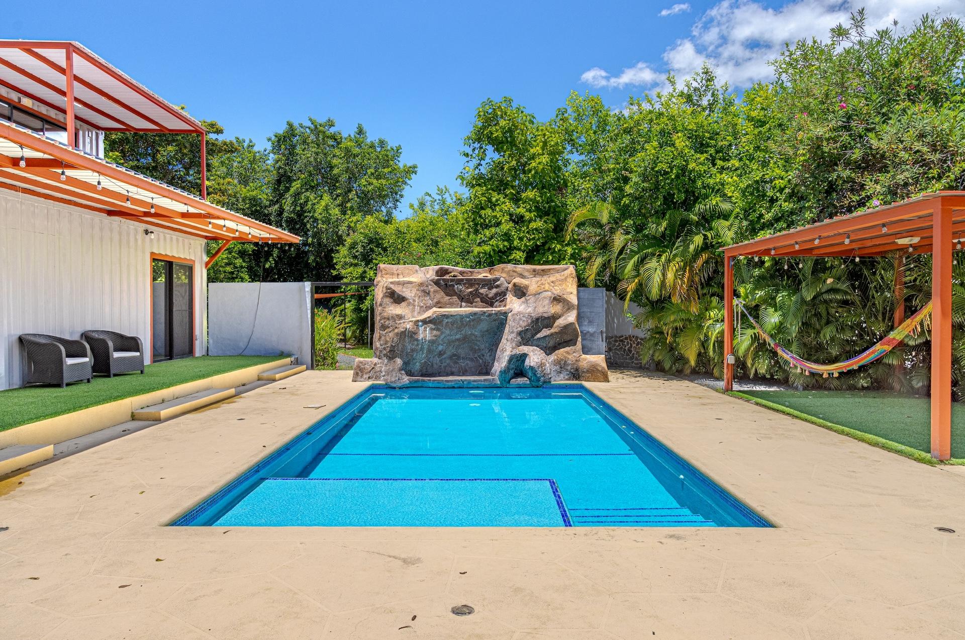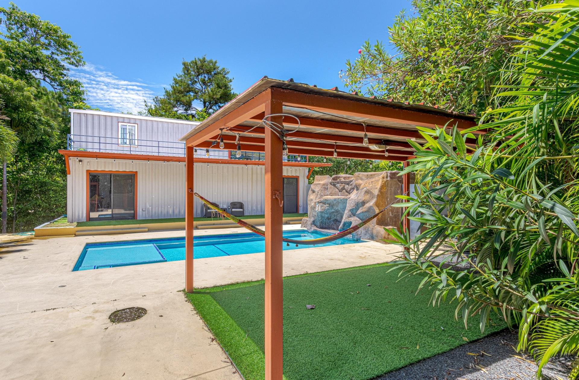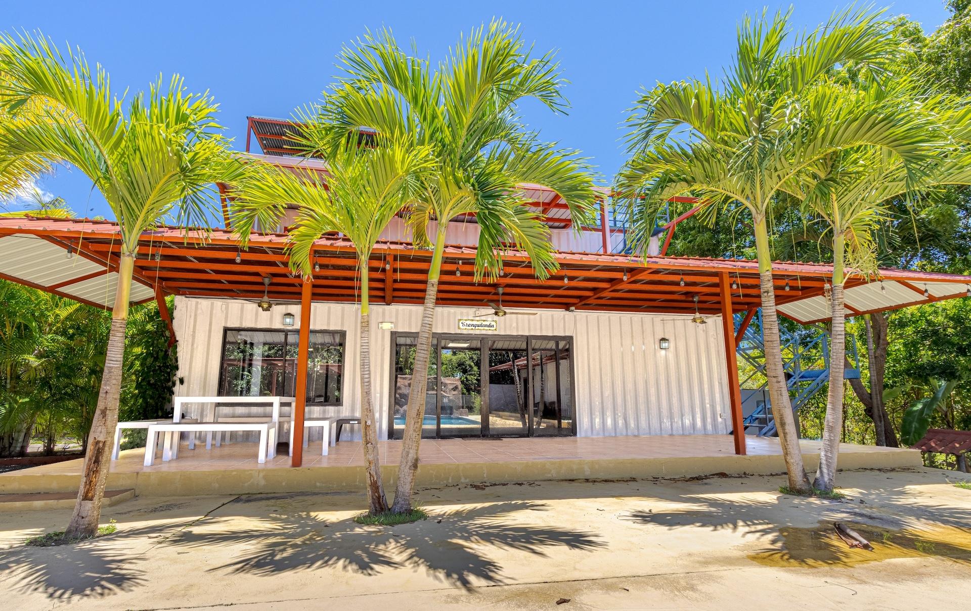 Don’t miss your chance to own this unique, income-producing compound just minutes from the beach in beautiful Costa Esmeralda. Set on nearly 1/2 acre of lush, palm-filled land, this one-of-a-kind property blends tropical living, sustainability, and modern design—all offered fully turnkey within a Panamanian corporation (included in sale). Main Residence Highlights: Crafted from multiple shipping containers and fully renovated, the main home offers 2,755 sq. ft. of interior living and 688 sq. ft. of covered outdoor space. 3 spacious bedrooms with en-suite bathrooms Brand new imported German kitchen with high-end appliances Open-concept living, dining & kitchen area perfect for entertaining Expansive rooftop terrace with sweeping views to Coronado and the mountains Covered patios, BBQ area, and resort-style pool In-ground pool powered by solar Outdoor bathroom and shower Guest Apartment + Bonus Building: The second container-built structure offers income-generating potential or expanded living options: Upstairs: A private 1-bed / 1-bath fully equipped studio apartment with separate entrance and views of the pool Downstairs: 640 sq. ft. of flexible space, ready to be finished as: A 2-bedroom rental unit A luxury master suite A yoga or wellness studio A retreat or business space A B&B or hostel conversion Private garden access allows guests to enjoy a quiet, separate entry. Sustainable Living Features: Solar panel system with 14,000 kW backup battery Connected to the grid with feedback system (avg. electric bill: under $2/month) 130 ft deep private well with two reserve tanks Eco-conscious design throughout Location: Set in the secure, beachs