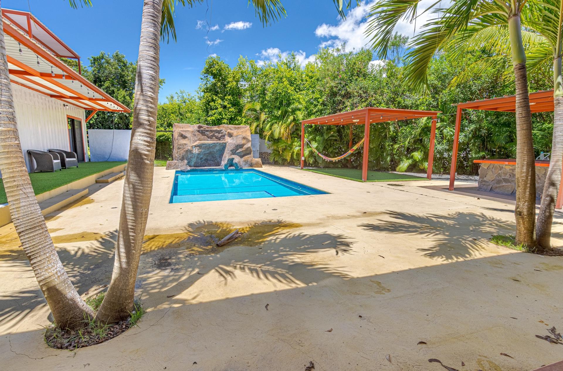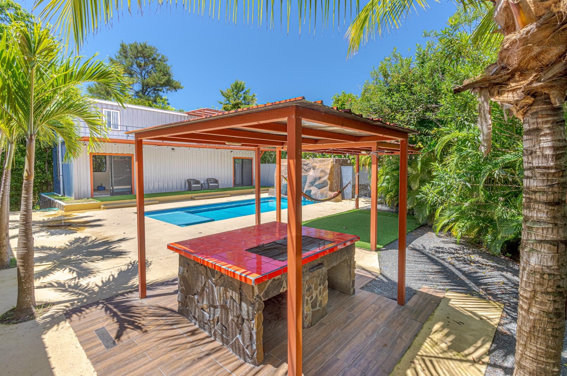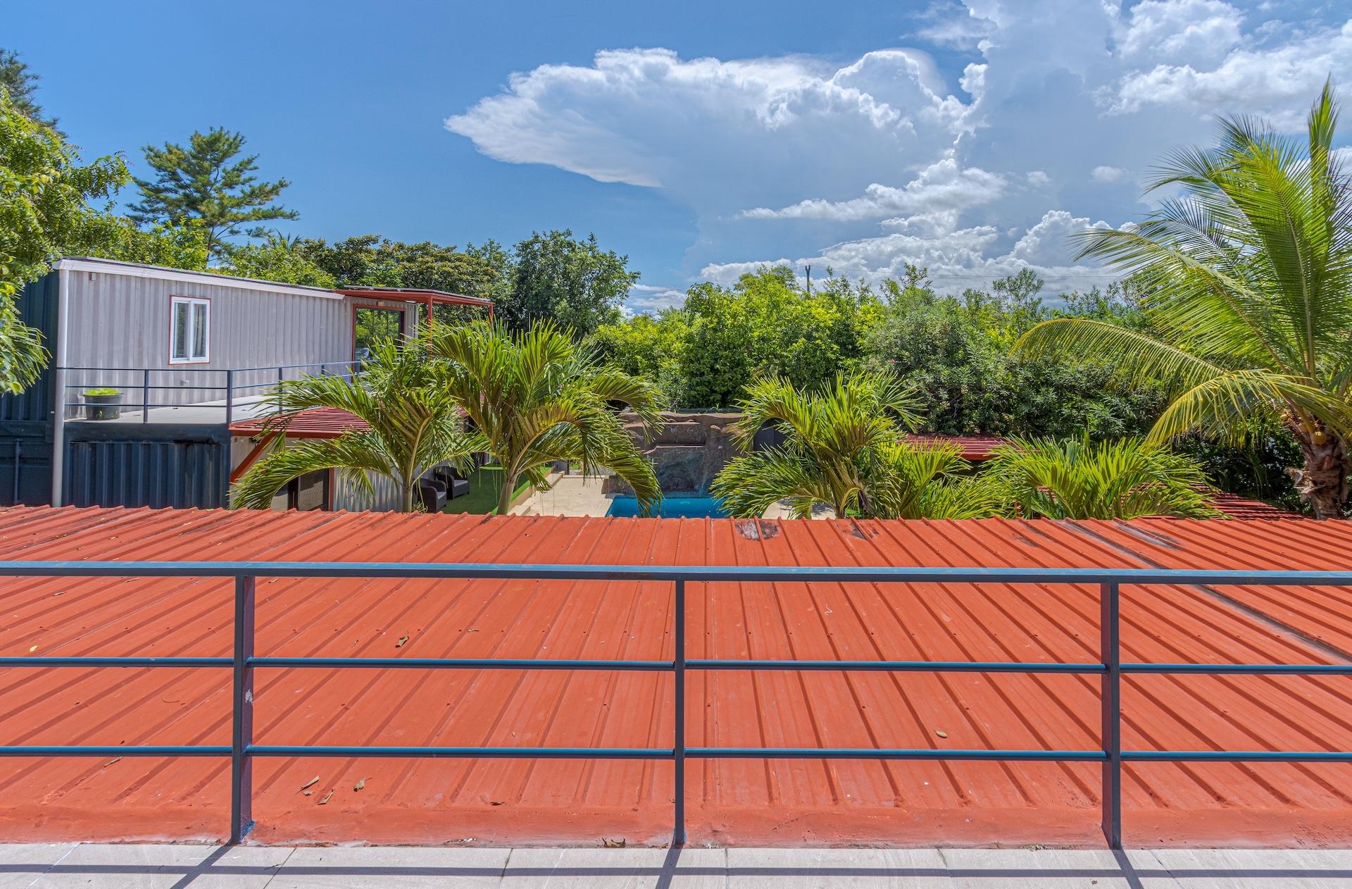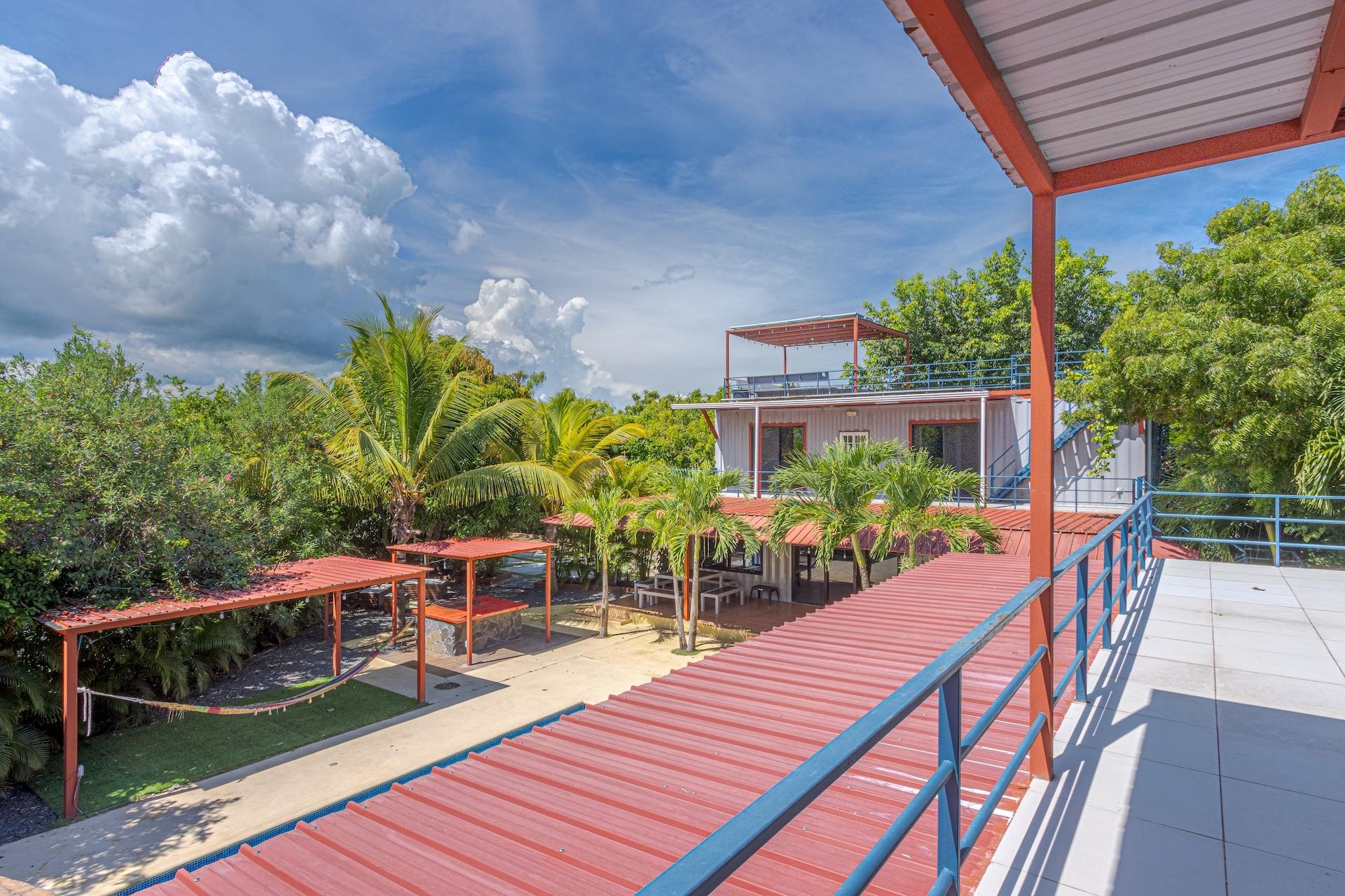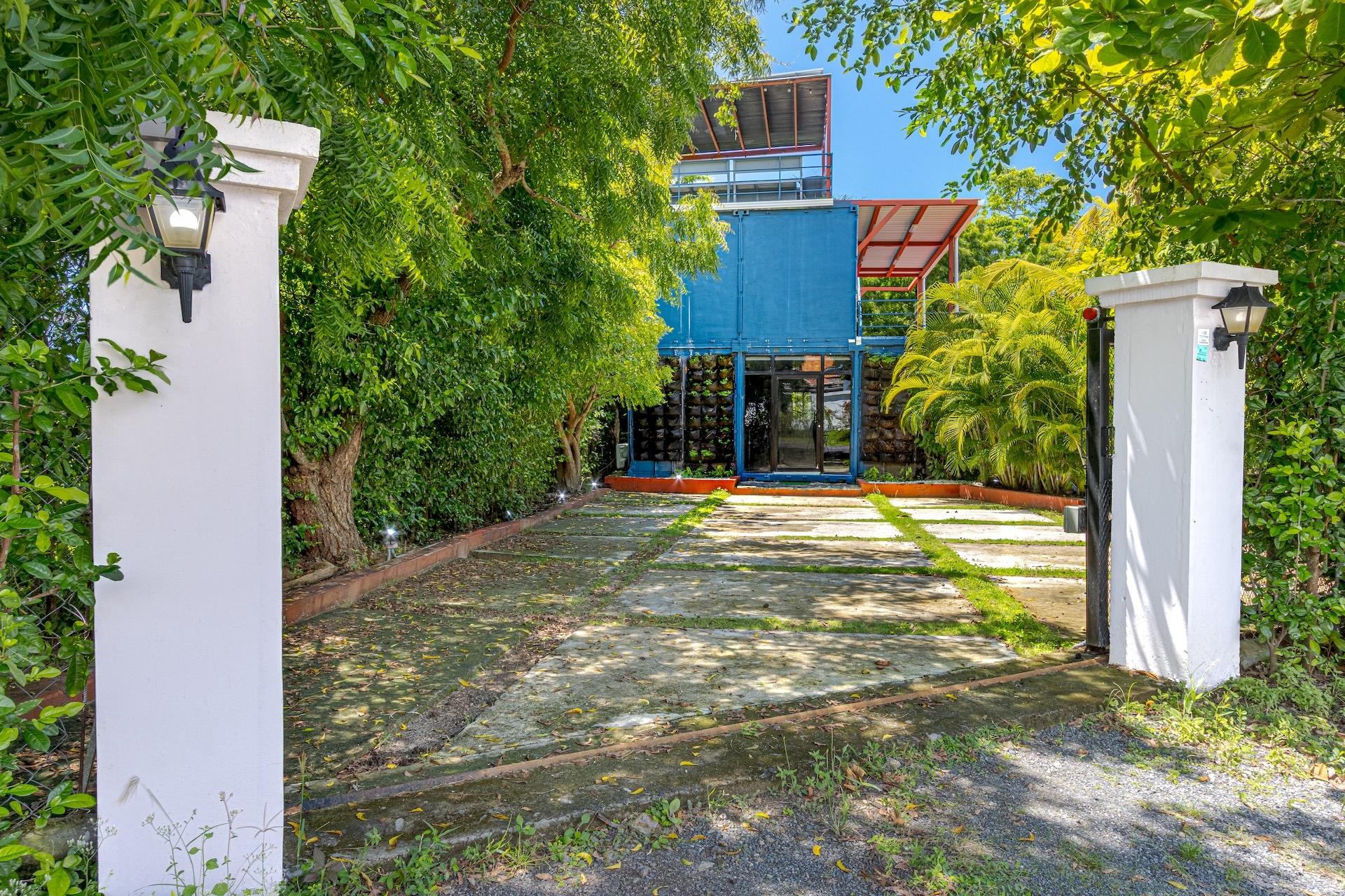 Don’t miss your chance to own this unique, income-producing compound just minutes from the beach in beautiful Costa Esmeralda. Set on nearly 1/2 acre of lush, palm-filled land, this one-of-a-kind property blends tropical living, sustainability, and modern design—all offered fully turnkey within a Panamanian corporation (included in sale). Main Residence Highlights: Crafted from multiple shipping containers and fully renovated, the main home offers 2,755 sq. ft. of interior living and 688 sq. ft. of covered outdoor space. 3 spacious bedrooms with en-suite bathrooms Brand new imported German kitchen with high-end appliances Open-concept living, dining & kitchen area perfect for entertaining Expansive rooftop terrace with sweeping views to Coronado and the mountains Covered patios, BBQ area, and resort-style pool In-ground pool powered by solar Outdoor bathroom and shower Guest Apartment + Bonus Building: The second container-built structure offers income-generating potential or expanded living options: Upstairs: A private 1-bed / 1-bath fully equipped studio apartment with separate entrance and views of the pool Downstairs: 640 sq. ft. of flexible space, ready to be finished as: A 2-bedroom rental unit A luxury master suite A yoga or wellness studio A retreat or business space A B&B or hostel conversion Private garden access allows guests to enjoy a quiet, separate entry. Sustainable Living Features: Solar panel system with 14,000 kW backup battery Connected to the grid with feedback system (avg. electric bill: under $2/month) 130 ft deep private well with two reserve tanks Eco-conscious design throughout Location: Set in the secure, beachs