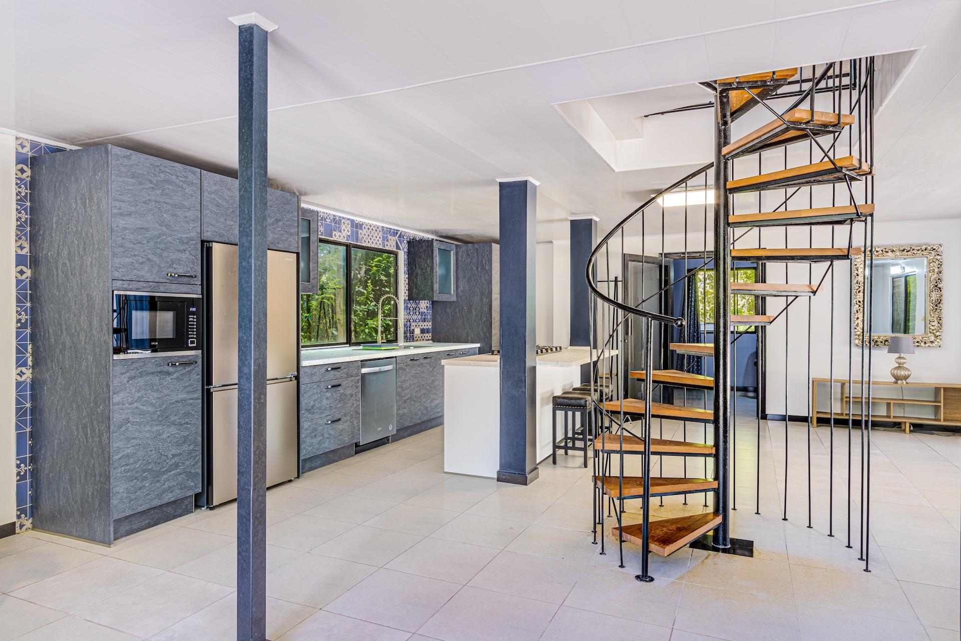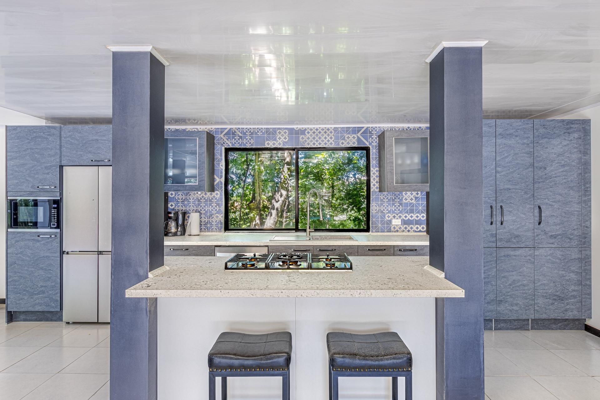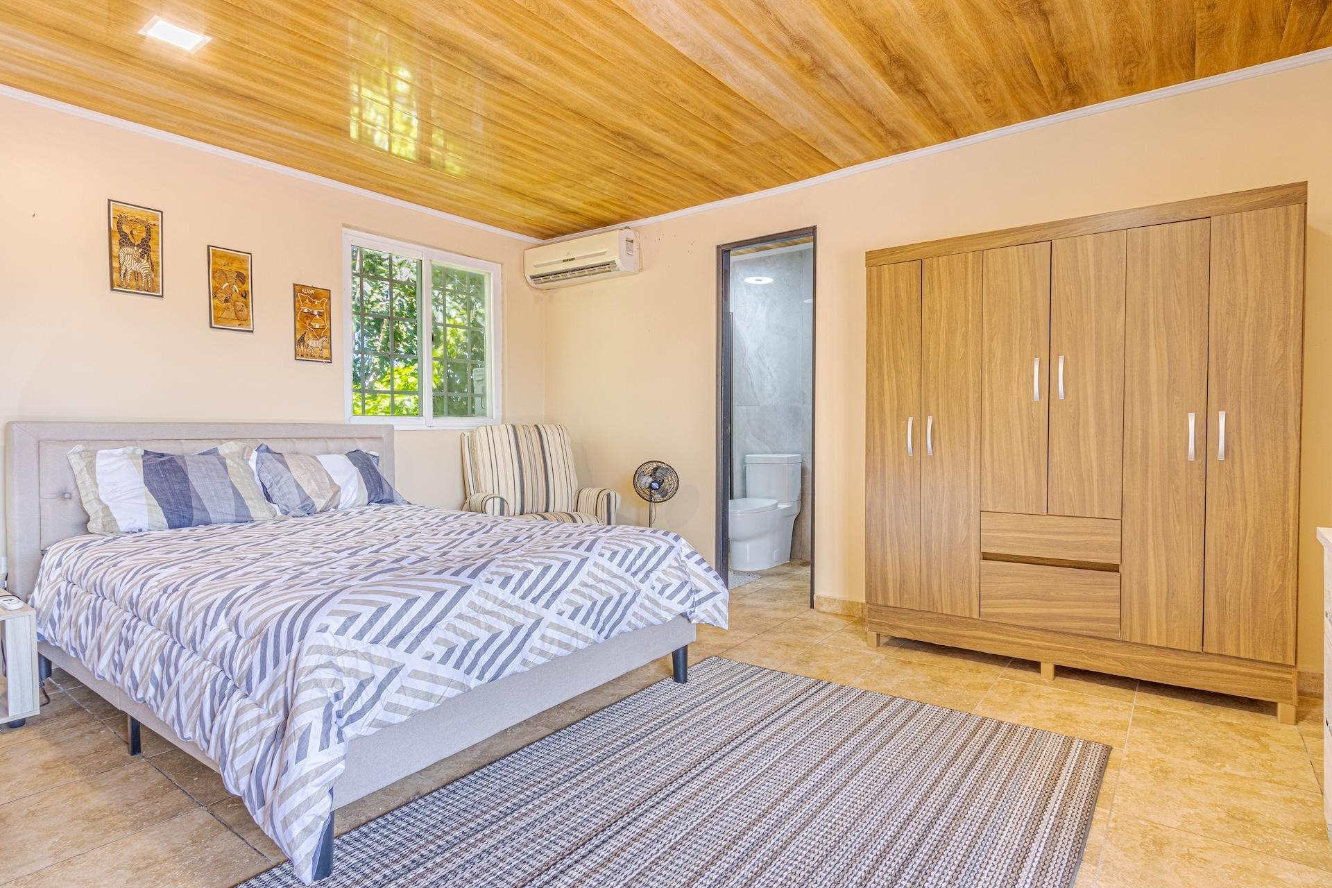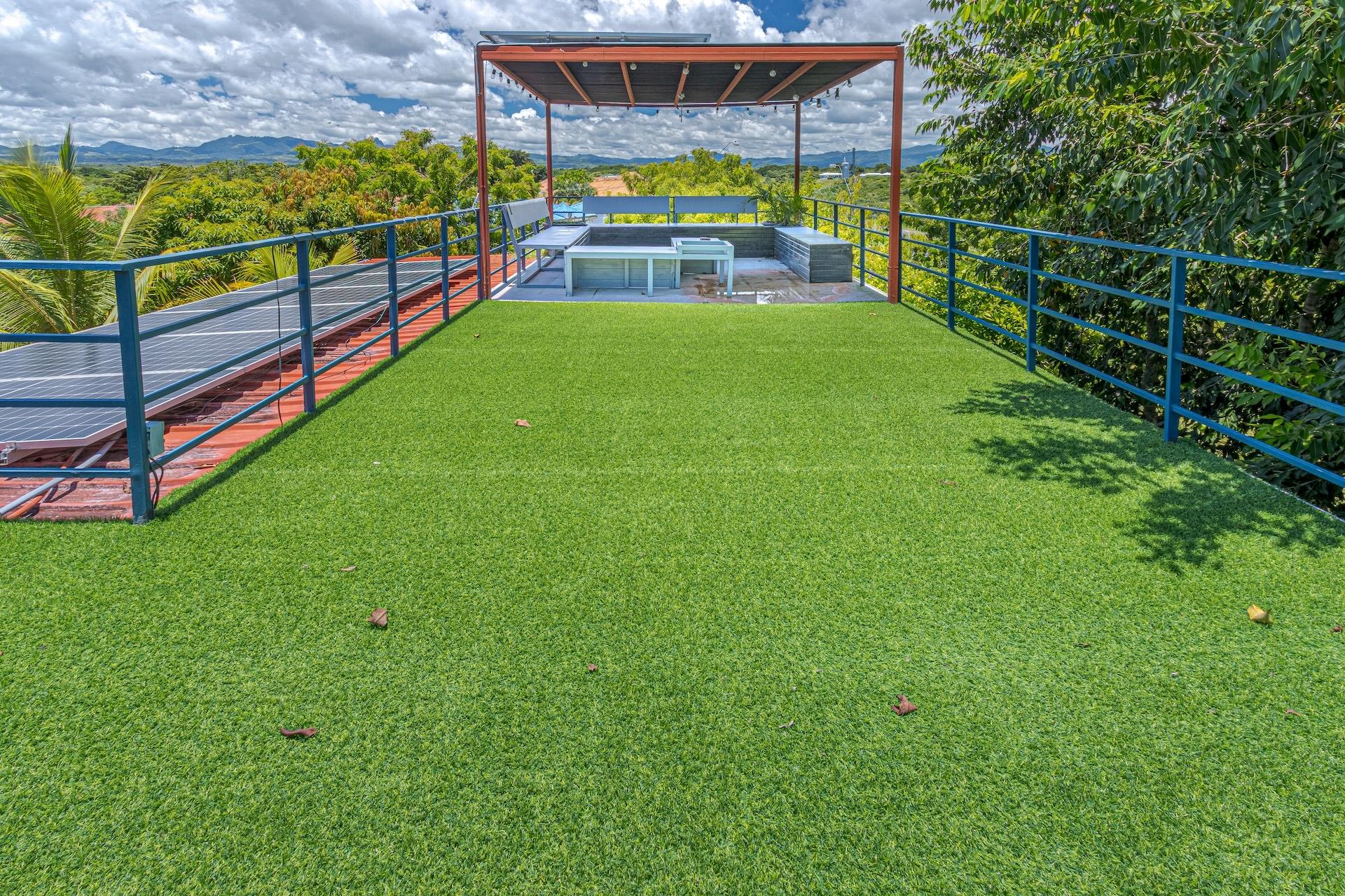 Don’t miss your chance to own this unique, income-producing compound just minutes from the beach in beautiful Costa Esmeralda. Set on nearly 1/2 acre of lush, palm-filled land, this one-of-a-kind property blends tropical living, sustainability, and modern design—all offered fully turnkey within a Panamanian corporation (included in sale). Main Residence Highlights: Crafted from multiple shipping containers and fully renovated, the main home offers 2,755 sq. ft. of interior living and 688 sq. ft. of covered outdoor space. 3 spacious bedrooms with en-suite bathrooms Brand new imported German kitchen with high-end appliances Open-concept living, dining & kitchen area perfect for entertaining Expansive rooftop terrace with sweeping views to Coronado and the mountains Covered patios, BBQ area, and resort-style pool In-ground pool powered by solar Outdoor bathroom and shower Guest Apartment + Bonus Building: The second container-built structure offers income-generating potential or expanded living options: Upstairs: A private 1-bed / 1-bath fully equipped studio apartment with separate entrance and views of the pool Downstairs: 640 sq. ft. of flexible space, ready to be finished as: A 2-bedroom rental unit A luxury master suite A yoga or wellness studio A retreat or business space A B&B or hostel conversion Private garden access allows guests to enjoy a quiet, separate entry. Sustainable Living Features: Solar panel system with 14,000 kW backup battery Connected to the grid with feedback system (avg. electric bill: under $2/month) 130 ft deep private well with two reserve tanks Eco-conscious design throughout Location: Set in the secure, beachs