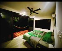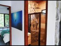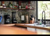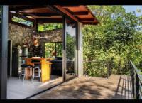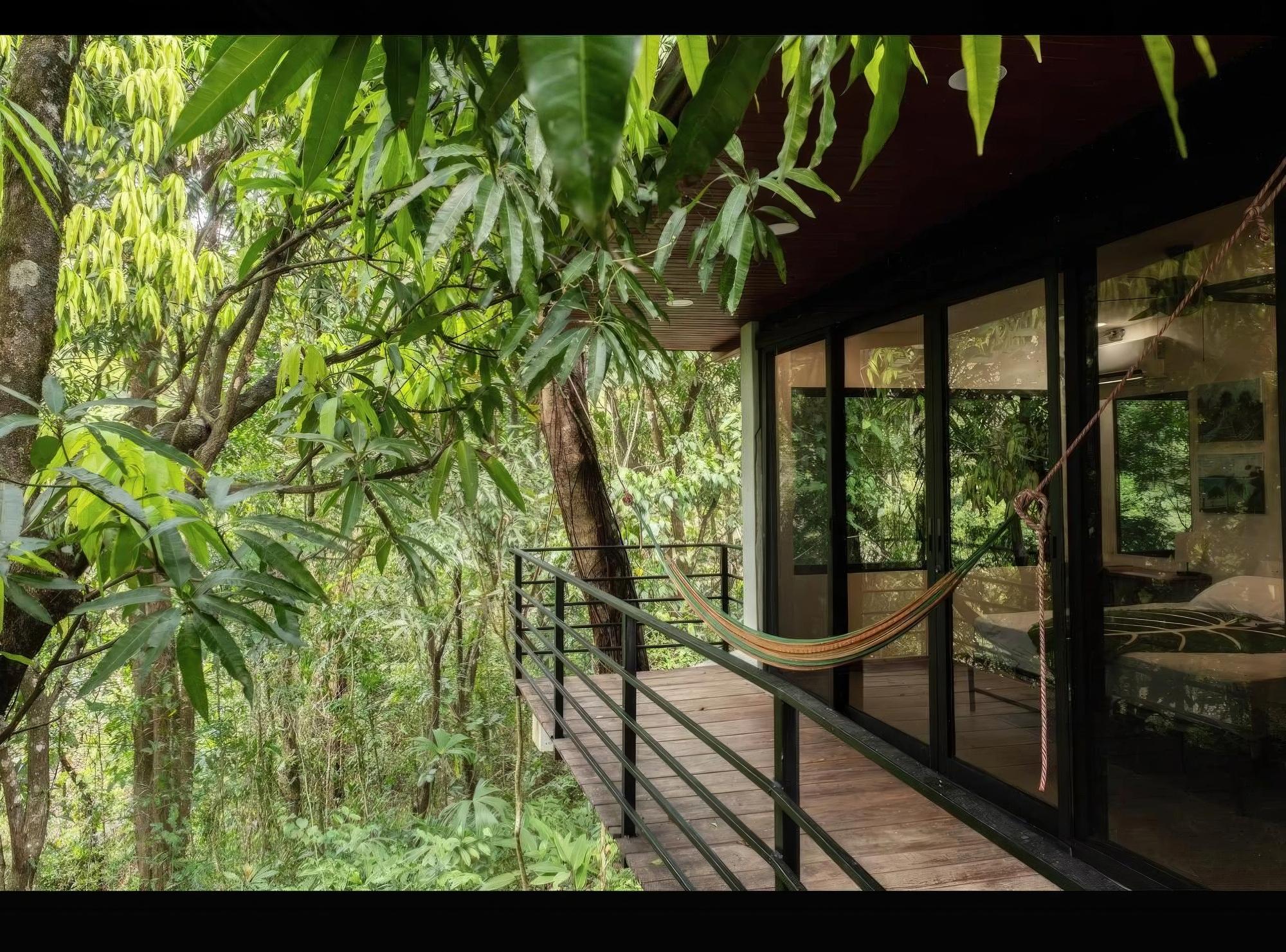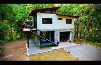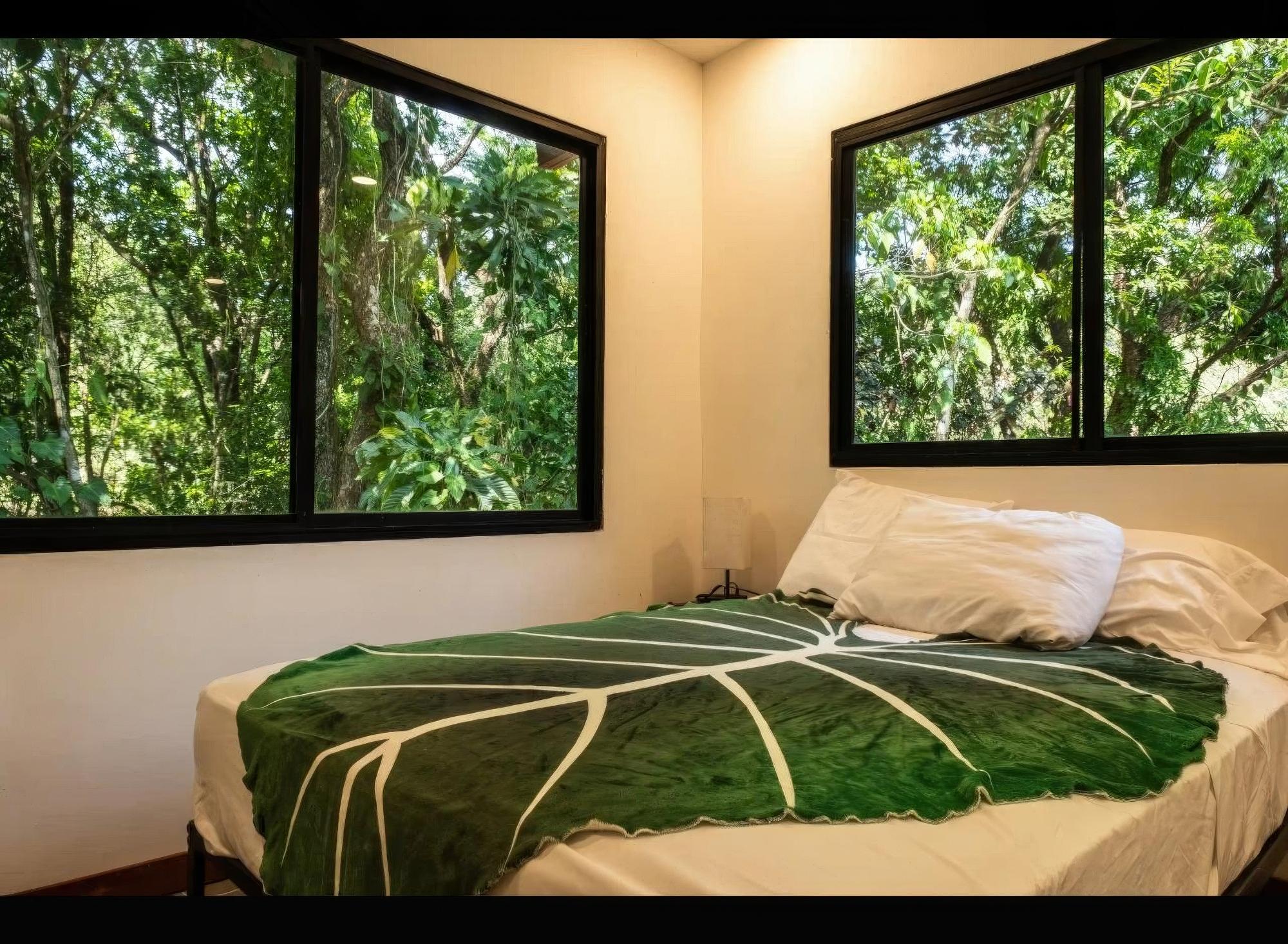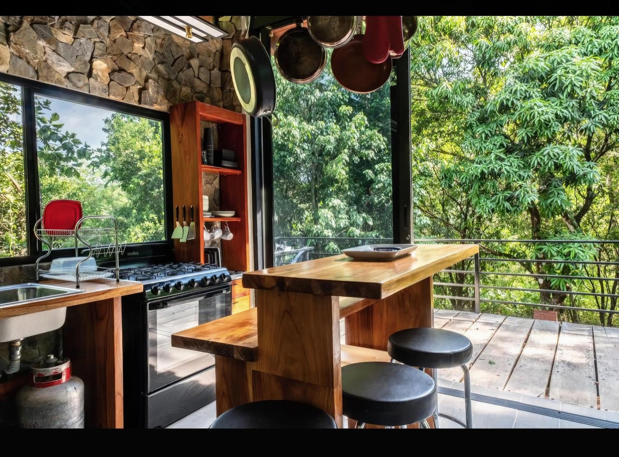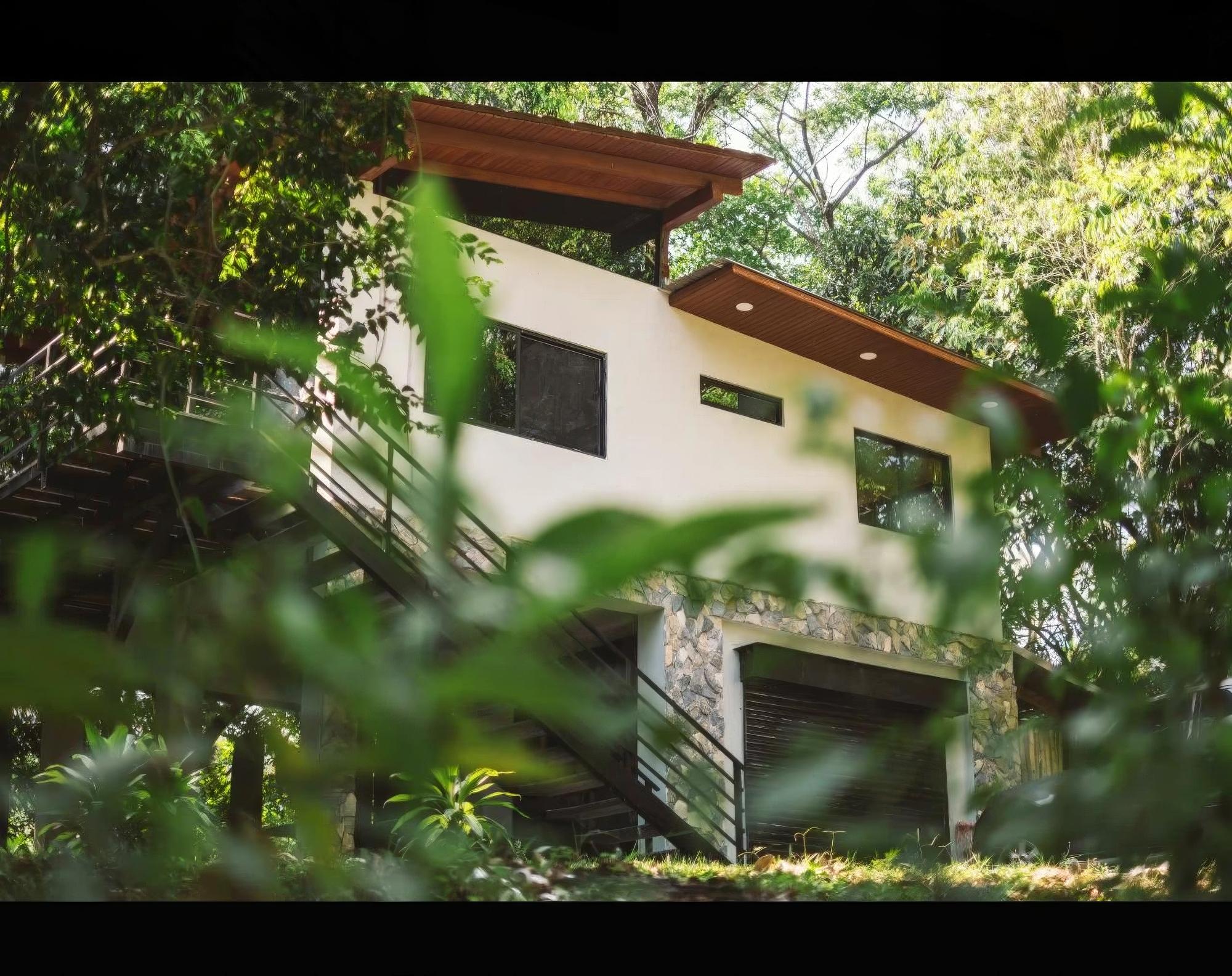 This unique home is set in a complete jungle setting, where it feels as if you are suspended in the trees. Surrounded by mature tropical growth and bordering a natural quebrada, the property offers an immersive connection with nature while maintaining modern comforts. The home is thoughtfully designed with clean lines, stone accents, and wide glass openings that invite in natural light and green views from every corner. The elevated position allows breezes to flow through the living spaces, creating a cool and refreshing environment year-round. Inside, the kitchen is stylish and practical, featuring stone wall details, large windows, and a natural wood island that serves as a central gathering spot. The two bedrooms are designed for comfort, each framed by large windows that place you right in the heart of the surrounding forest. The bathrooms echo the natural theme with stone finishes and a modern layout. Outdoor living is central to this home, with decks and balconies that extend into the treetops. A hammock corner makes for the perfect place to relax, while the wraparound terrace brings you closer to the sounds of birds and rustling leaves. Down below, the home includes a generous garage space that doubles as a flexible area. It could easily be converted into an additional bedroom studio, a rental unit, or left open as a gym, workshop, or storage area. The option to adapt this space makes the property versatile for a variety of lifestyles. The property spans over 4,300 m² and is fully serviced with a private well, fiber optic internet, and electricity.