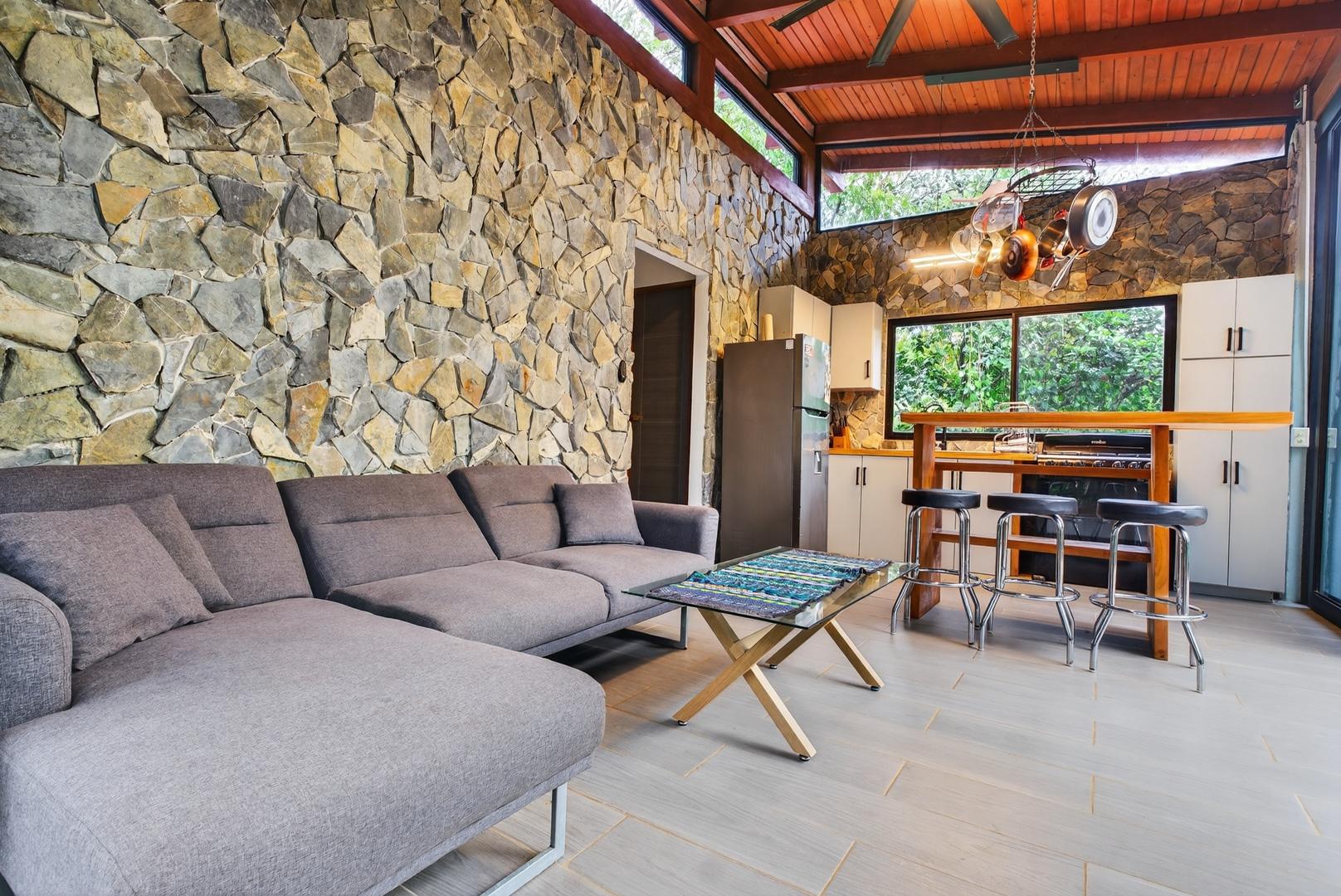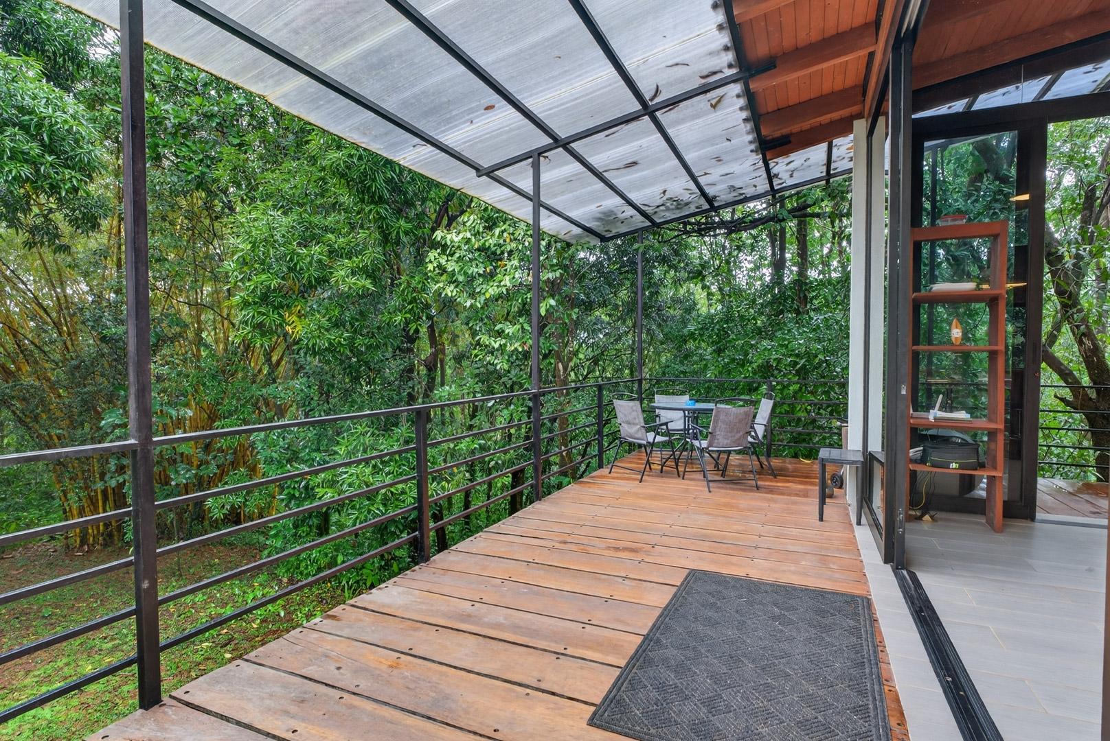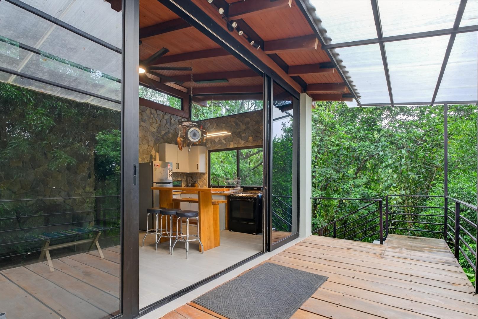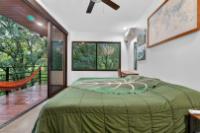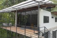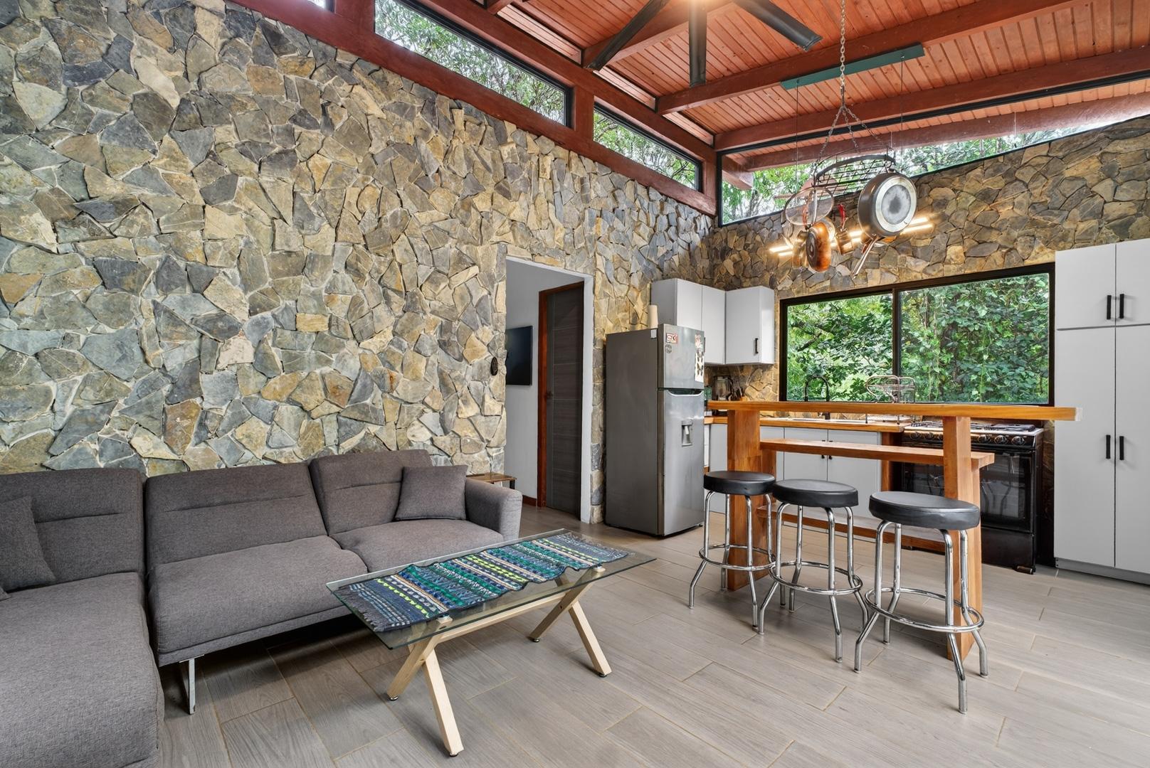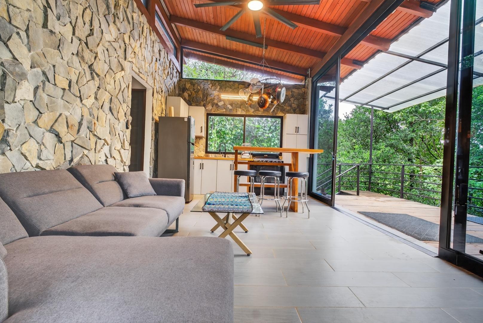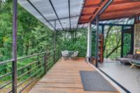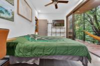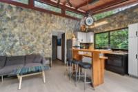 This unique home is set in a complete jungle setting, where it feels as if you are suspended in the trees. Surrounded by mature tropical growth and bordering a natural quebrada, the property offers an immersive connection with nature while maintaining modern comforts. The home is thoughtfully designed with clean lines, stone accents, and wide glass openings that invite in natural light and green views from every corner. The elevated position allows breezes to flow through the living spaces, creating a cool and refreshing environment year-round. Inside, the kitchen is stylish and practical, featuring stone wall details, large windows, and a natural wood island that serves as a central gathering spot. The two bedrooms are designed for comfort, each framed by large windows that place you right in the heart of the surrounding forest. The bathrooms echo the natural theme with stone finishes and a modern layout. Outdoor living is central to this home, with decks and balconies that extend into the treetops. A hammock corner makes for the perfect place to relax, while the wraparound terrace brings you closer to the sounds of birds and rustling leaves. Down below, the home includes a generous garage space that doubles as a flexible area. It could easily be converted into an additional bedroom studio, a rental unit, or left open as a gym, workshop, or storage area. The option to adapt this space makes the property versatile for a variety of lifestyles. The property spans over 4,300 m² and is fully serviced with a private well, fiber optic internet, and electricity.
