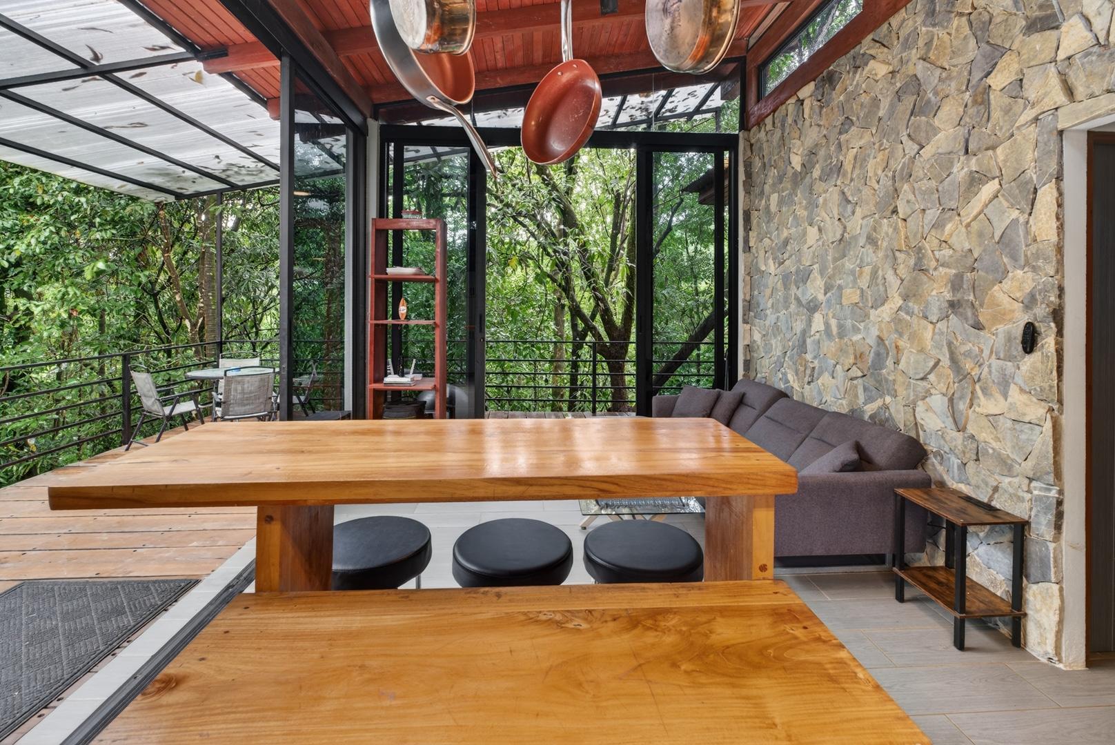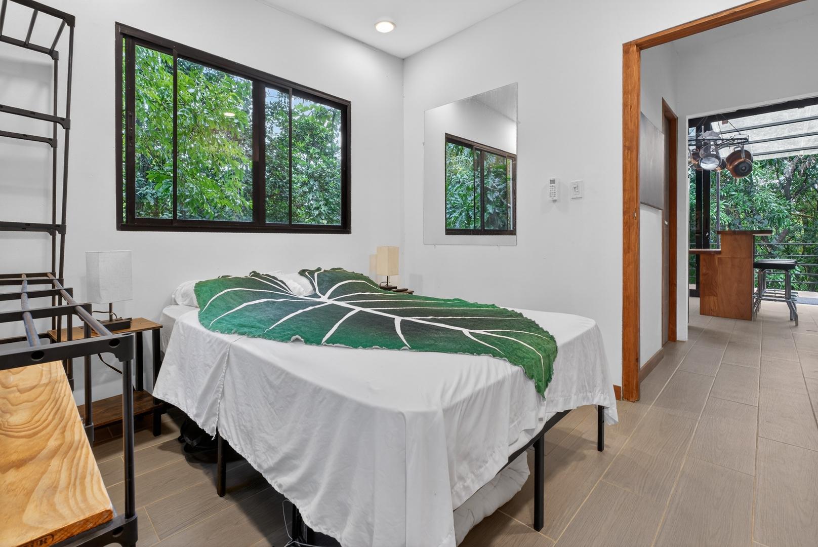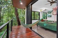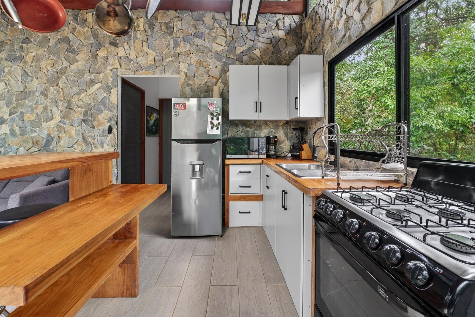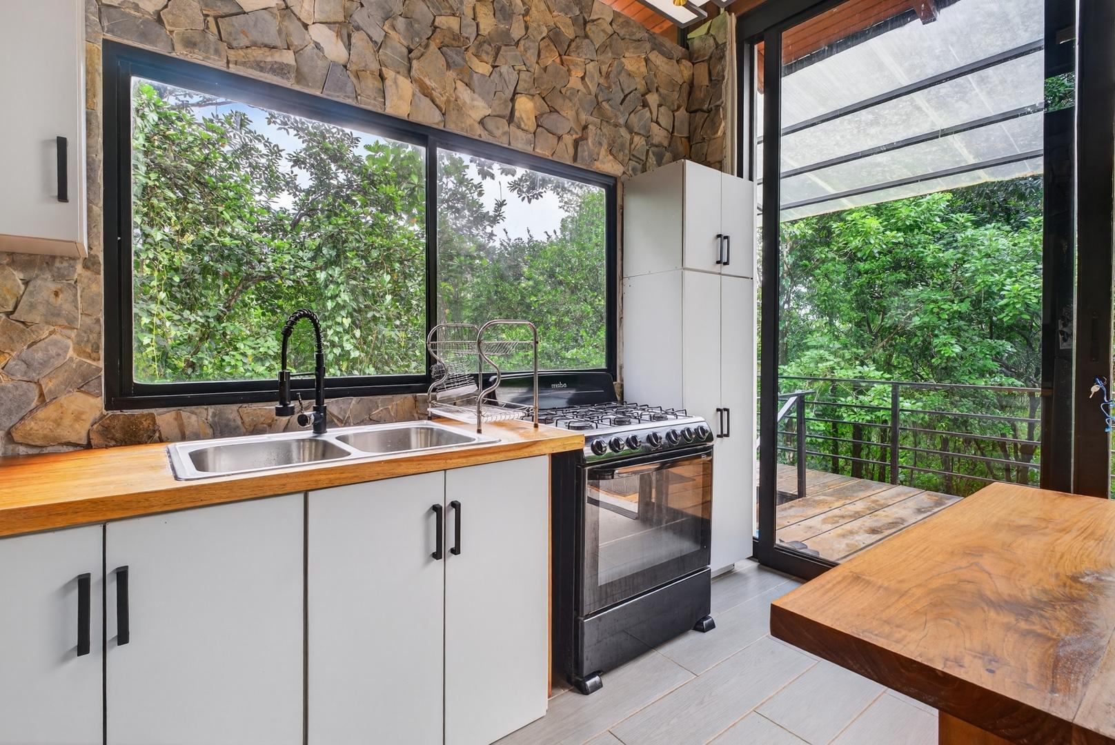 This unique home is set in a complete jungle setting, where it feels as if you are suspended in the trees. Surrounded by mature tropical growth and bordering a natural quebrada, the property offers an immersive connection with nature while maintaining modern comforts. The home is thoughtfully designed with clean lines, stone accents, and wide glass openings that invite in natural light and green views from every corner. The elevated position allows breezes to flow through the living spaces, creating a cool and refreshing environment year-round. Inside, the kitchen is stylish and practical, featuring stone wall details, large windows, and a natural wood island that serves as a central gathering spot. The two bedrooms are designed for comfort, each framed by large windows that place you right in the heart of the surrounding forest. The bathrooms echo the natural theme with stone finishes and a modern layout. Outdoor living is central to this home, with decks and balconies that extend into the treetops. A hammock corner makes for the perfect place to relax, while the wraparound terrace brings you closer to the sounds of birds and rustling leaves. Down below, the home includes a generous garage space that doubles as a flexible area. It could easily be converted into an additional bedroom studio, a rental unit, or left open as a gym, workshop, or storage area. The option to adapt this space makes the property versatile for a variety of lifestyles. The property spans over 4,300 m² and is fully serviced with a private well, fiber optic internet, and electricity.