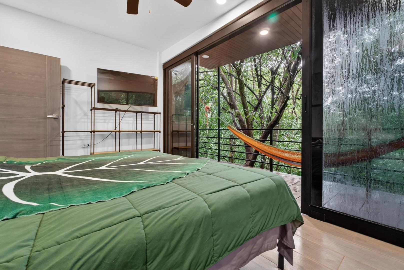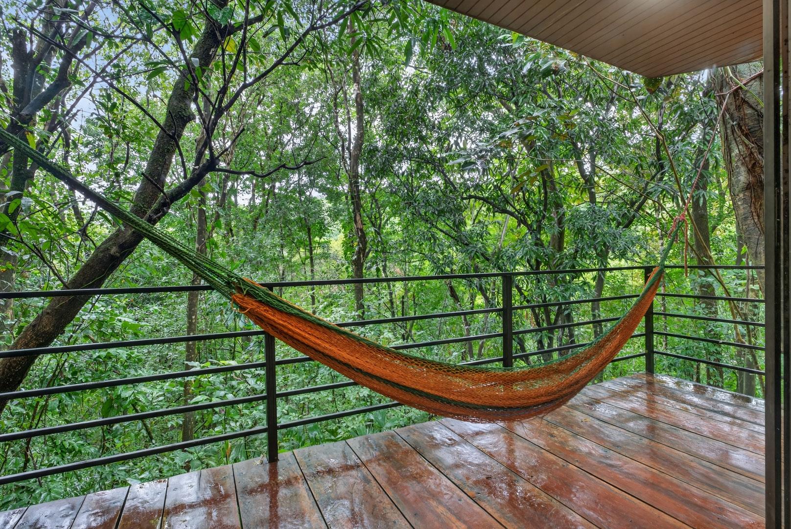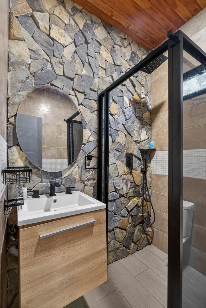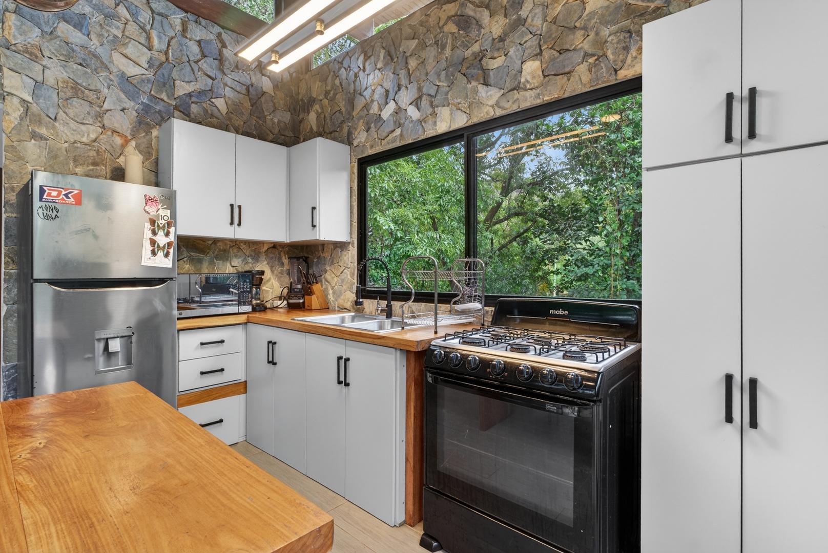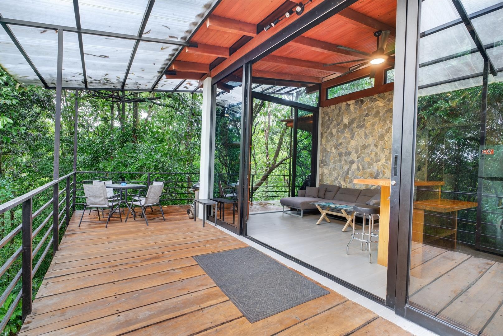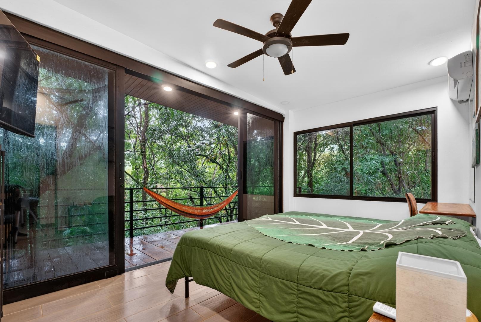 This unique home is set in a complete jungle setting, where it feels as if you are suspended in the trees. Surrounded by mature tropical growth and bordering a natural quebrada, the property offers an immersive connection with nature while maintaining modern comforts. The home is thoughtfully designed with clean lines, stone accents, and wide glass openings that invite in natural light and green views from every corner. The elevated position allows breezes to flow through the living spaces, creating a cool and refreshing environment year-round. Inside, the kitchen is stylish and practical, featuring stone wall details, large windows, and a natural wood island that serves as a central gathering spot. The two bedrooms are designed for comfort, each framed by large windows that place you right in the heart of the surrounding forest. The bathrooms echo the natural theme with stone finishes and a modern layout. Outdoor living is central to this home, with decks and balconies that extend into the treetops. A hammock corner makes for the perfect place to relax, while the wraparound terrace brings you closer to the sounds of birds and rustling leaves. Down below, the home includes a generous garage space that doubles as a flexible area. It could easily be converted into an additional bedroom studio, a rental unit, or left open as a gym, workshop, or storage area. The option to adapt this space makes the property versatile for a variety of lifestyles. The property spans over 4,300 m² and is fully serviced with a private well, fiber optic internet, and electricity.