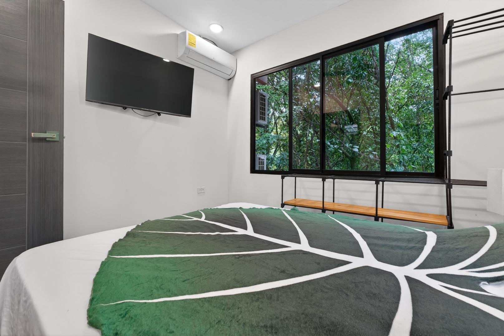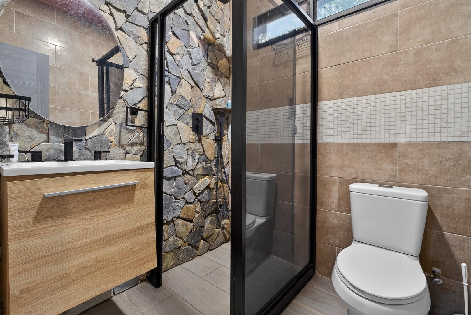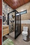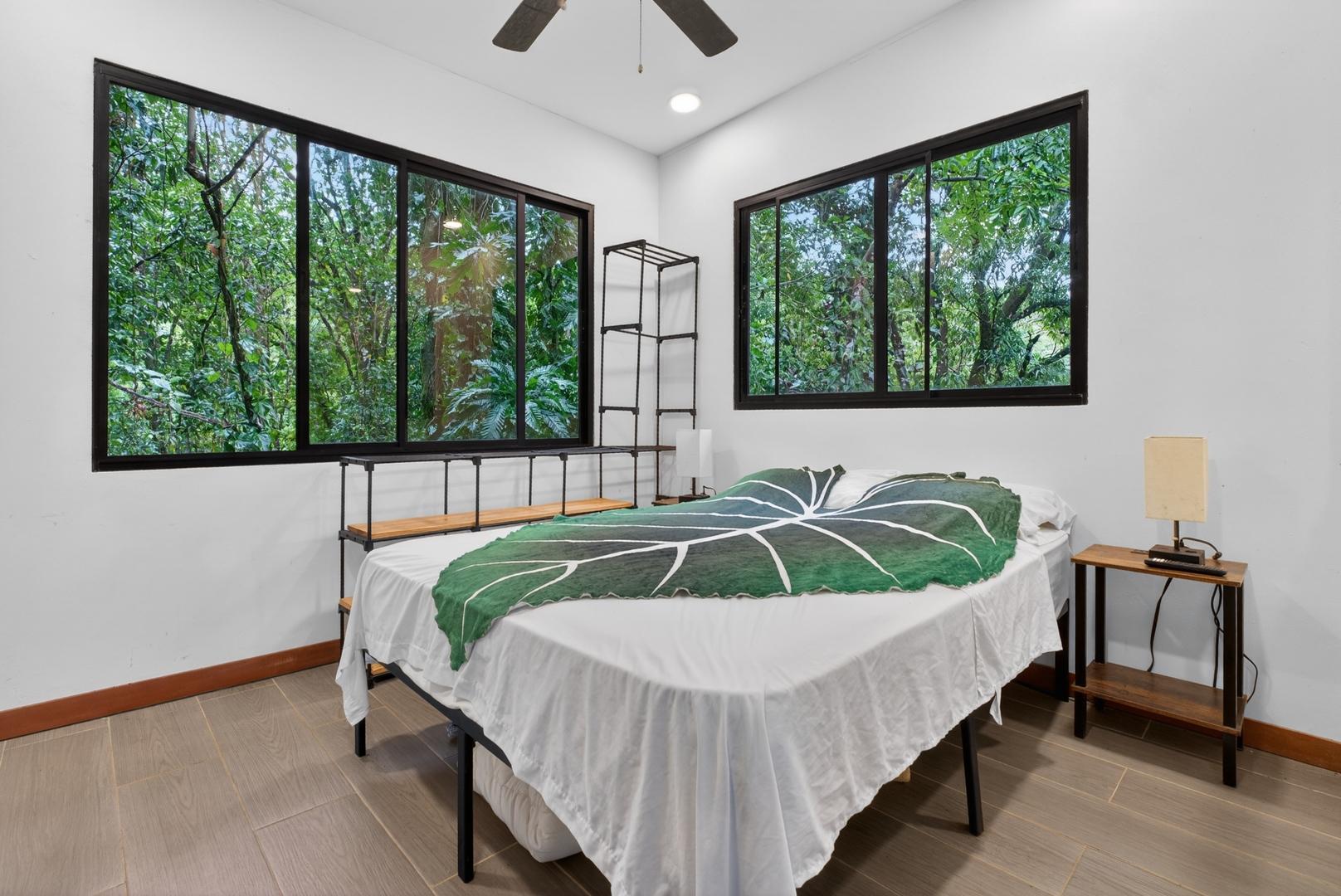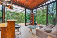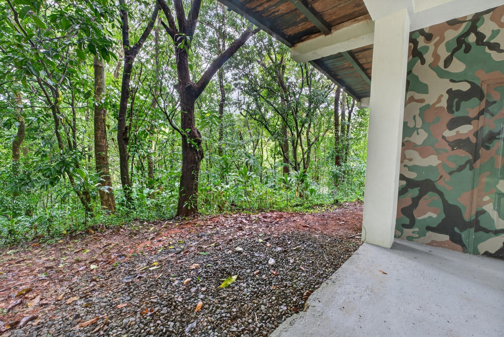 This unique home is set in a complete jungle setting, where it feels as if you are suspended in the trees. Surrounded by mature tropical growth and bordering a natural quebrada, the property offers an immersive connection with nature while maintaining modern comforts. The home is thoughtfully designed with clean lines, stone accents, and wide glass openings that invite in natural light and green views from every corner. The elevated position allows breezes to flow through the living spaces, creating a cool and refreshing environment year-round. Inside, the kitchen is stylish and practical, featuring stone wall details, large windows, and a natural wood island that serves as a central gathering spot. The two bedrooms are designed for comfort, each framed by large windows that place you right in the heart of the surrounding forest. The bathrooms echo the natural theme with stone finishes and a modern layout. Outdoor living is central to this home, with decks and balconies that extend into the treetops. A hammock corner makes for the perfect place to relax, while the wraparound terrace brings you closer to the sounds of birds and rustling leaves. Down below, the home includes a generous garage space that doubles as a flexible area. It could easily be converted into an additional bedroom studio, a rental unit, or left open as a gym, workshop, or storage area. The option to adapt this space makes the property versatile for a variety of lifestyles. The property spans over 4,300 m² and is fully serviced with a private well, fiber optic internet, and electricity.