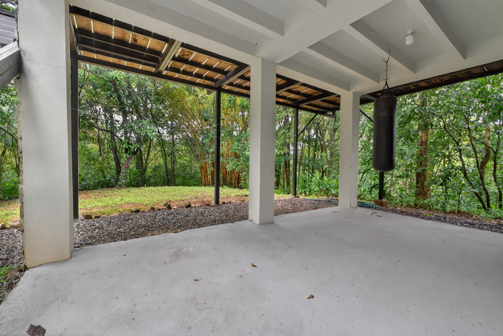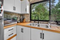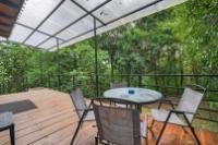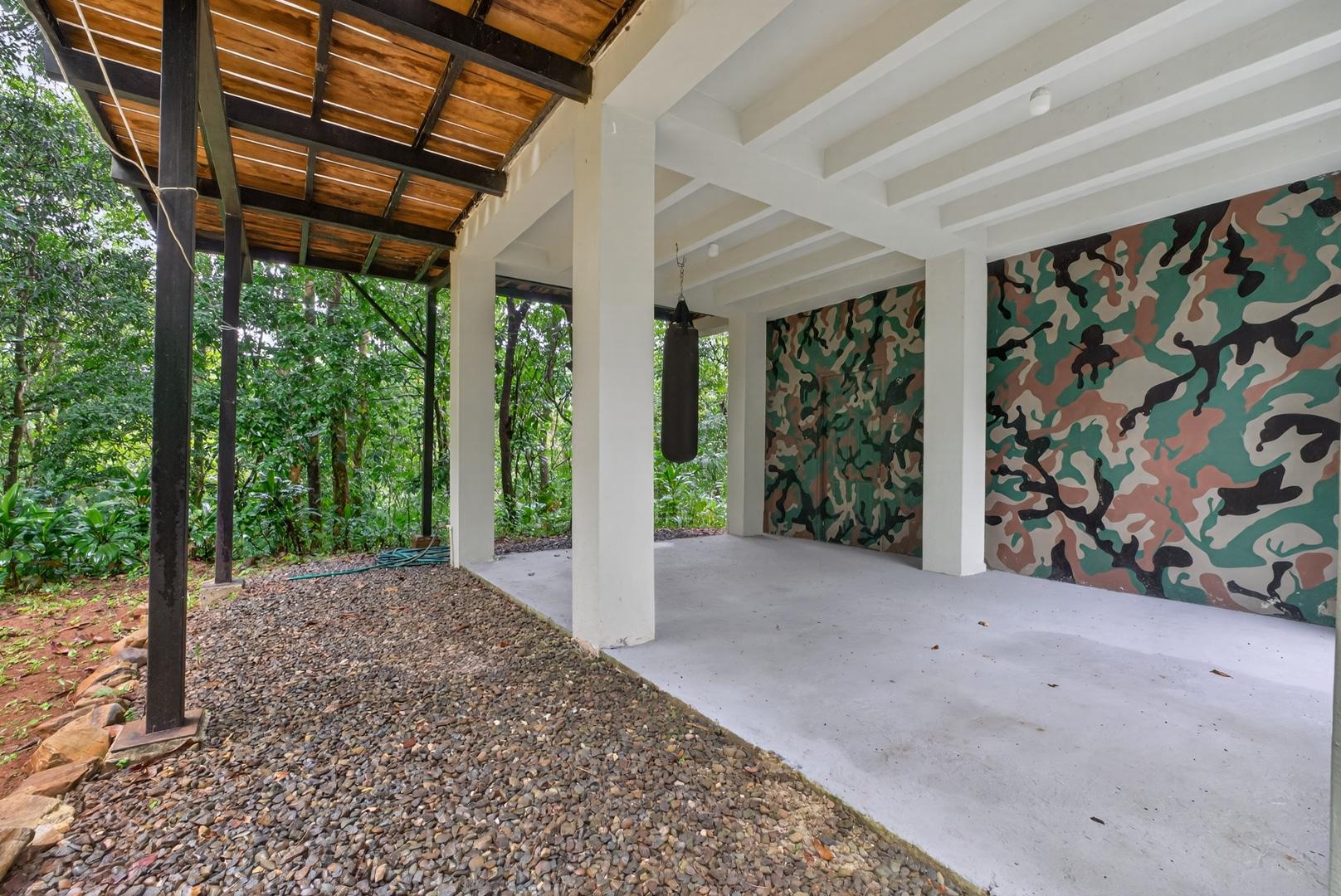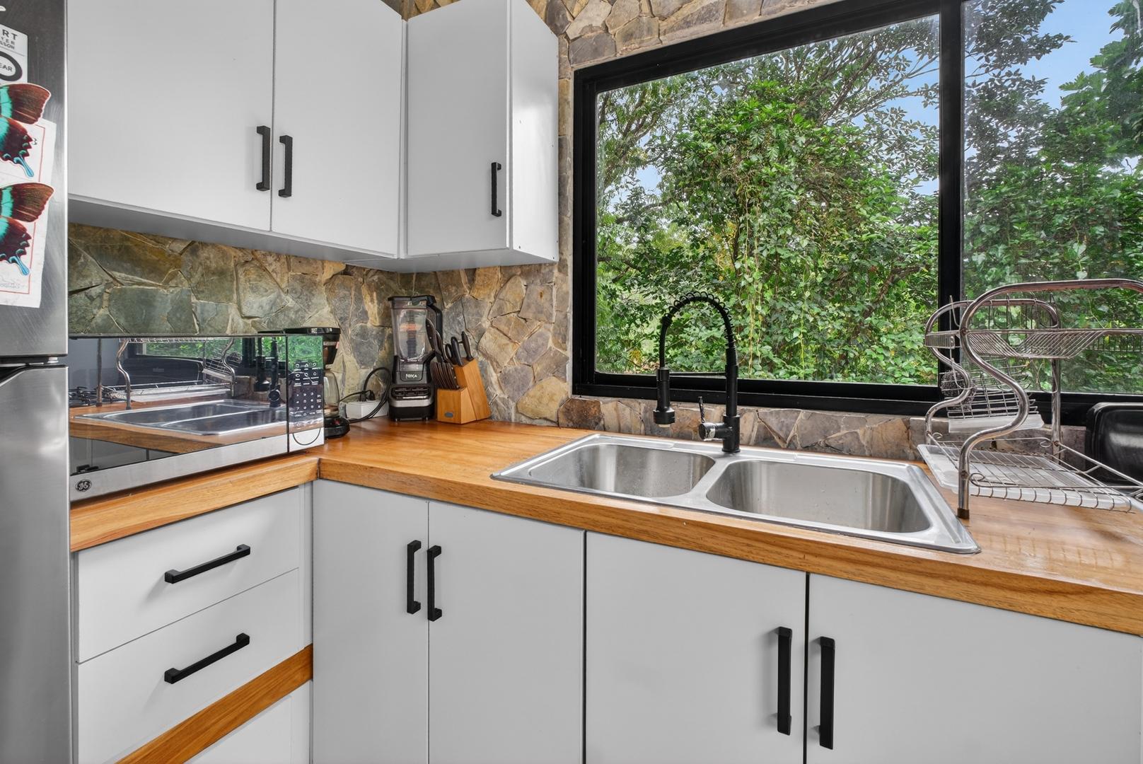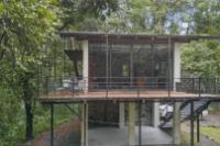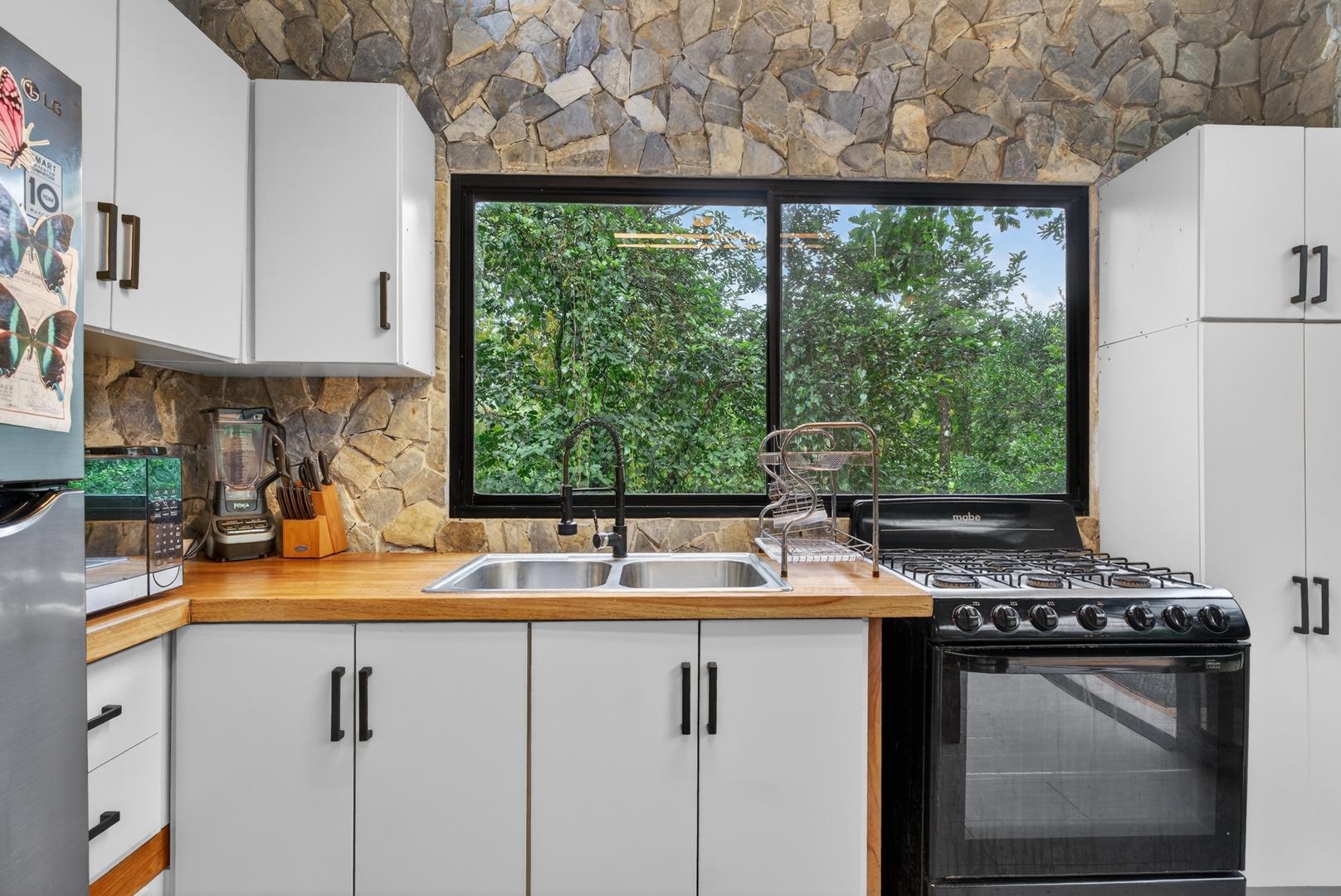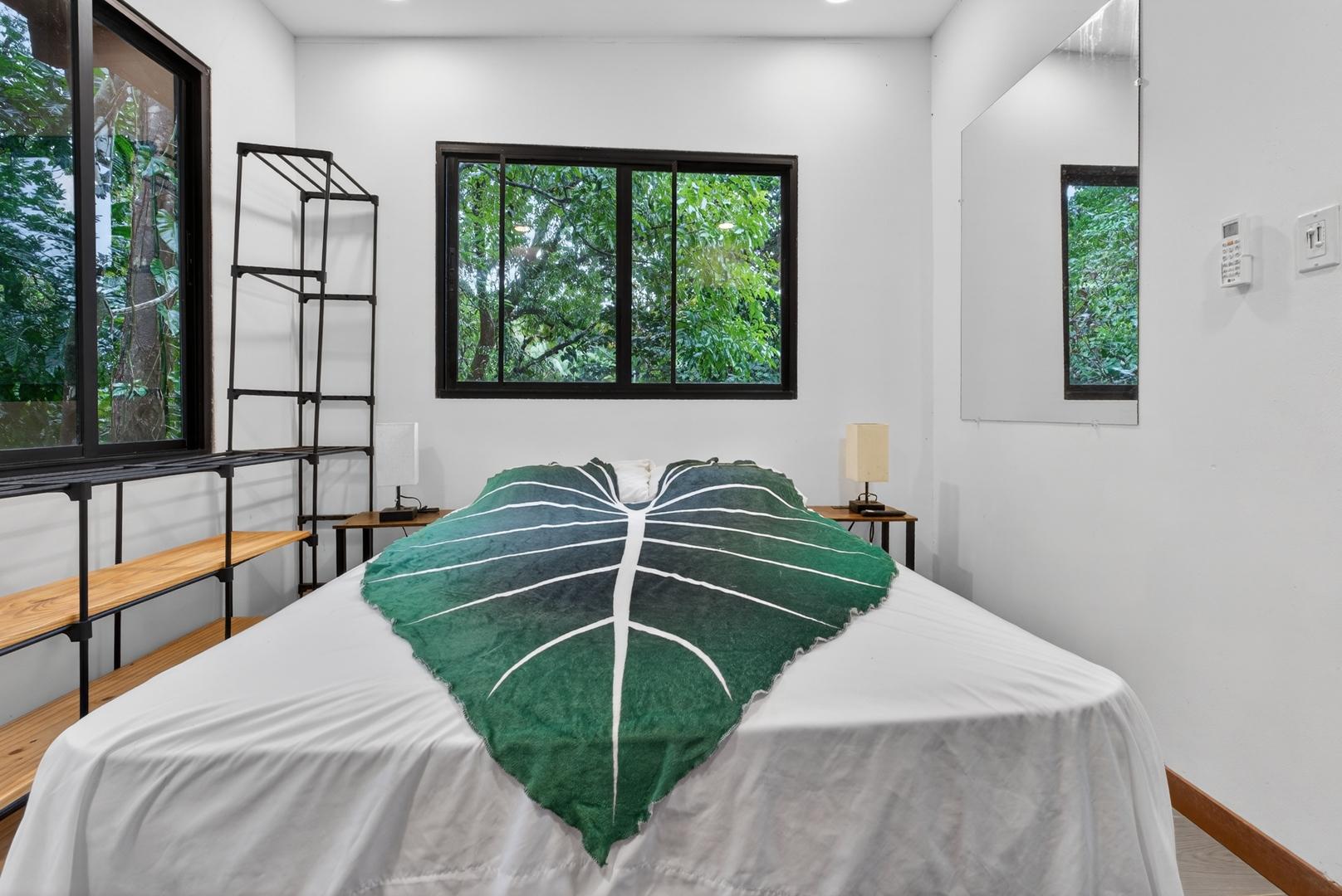 This unique home is set in a complete jungle setting, where it feels as if you are suspended in the trees. Surrounded by mature tropical growth and bordering a natural quebrada, the property offers an immersive connection with nature while maintaining modern comforts. The home is thoughtfully designed with clean lines, stone accents, and wide glass openings that invite in natural light and green views from every corner. The elevated position allows breezes to flow through the living spaces, creating a cool and refreshing environment year-round. Inside, the kitchen is stylish and practical, featuring stone wall details, large windows, and a natural wood island that serves as a central gathering spot. The two bedrooms are designed for comfort, each framed by large windows that place you right in the heart of the surrounding forest. The bathrooms echo the natural theme with stone finishes and a modern layout. Outdoor living is central to this home, with decks and balconies that extend into the treetops. A hammock corner makes for the perfect place to relax, while the wraparound terrace brings you closer to the sounds of birds and rustling leaves. Down below, the home includes a generous garage space that doubles as a flexible area. It could easily be converted into an additional bedroom studio, a rental unit, or left open as a gym, workshop, or storage area. The option to adapt this space makes the property versatile for a variety of lifestyles. The property spans over 4,300 m² and is fully serviced with a private well, fiber optic internet, and electricity.