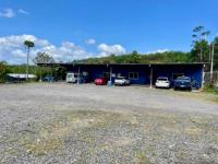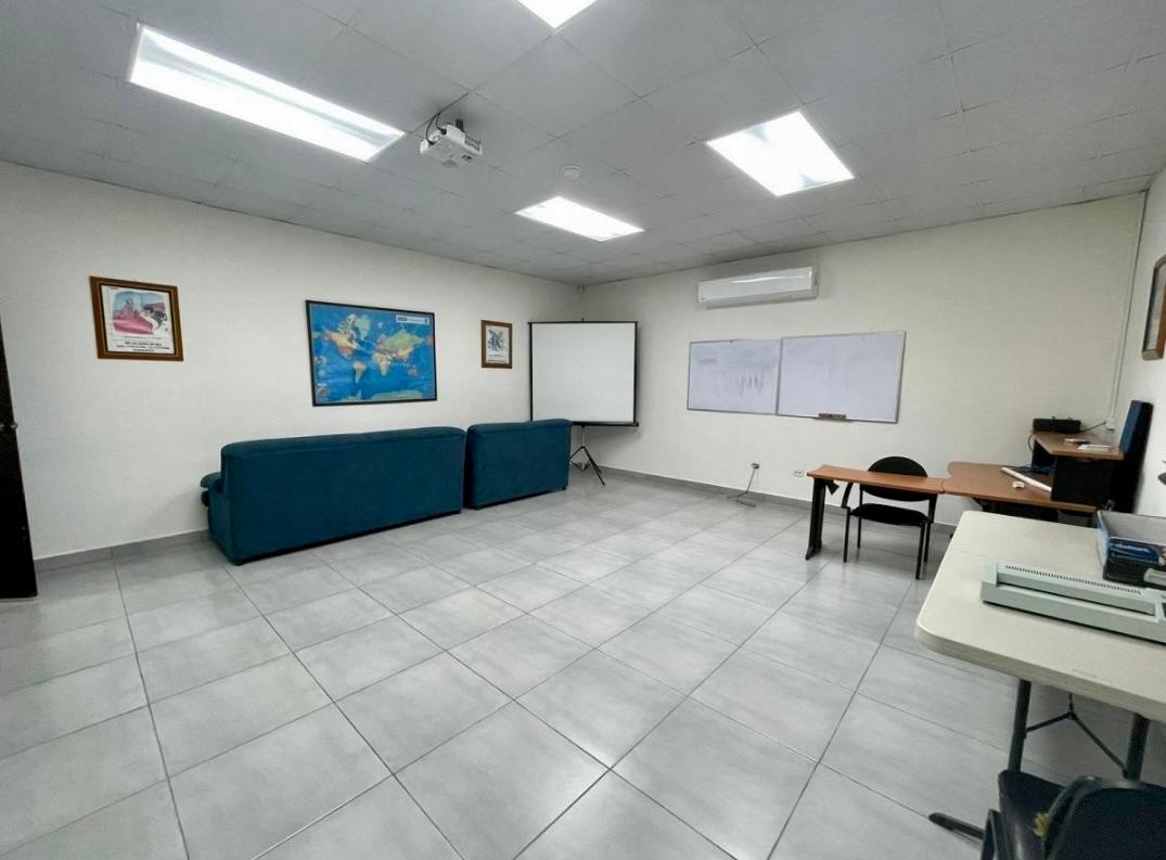The property features a main building at street level, with office areas, covered parking, storage, a cafeteria, a staff dining room, restrooms, and an employee area. There is also an annex with offices accessed via a covered concrete staircase. Facilities include full restrooms (with showers and ceramic and tile finishes), a fully equipped cafeteria, storage, and staff support spaces. The main entrance is through a 5-meter-high sliding metal gate. The entire perimeter is fenced with blocks and cyclone mesh, with retaining walls at the rear and left side.
