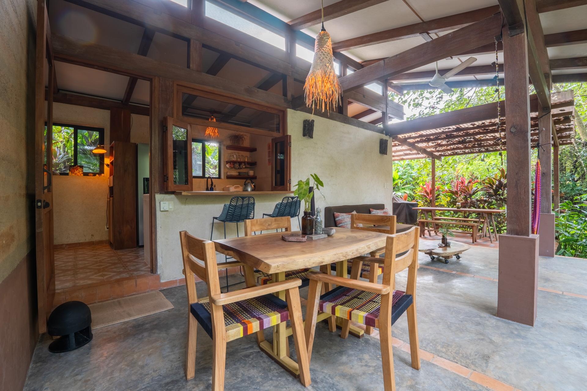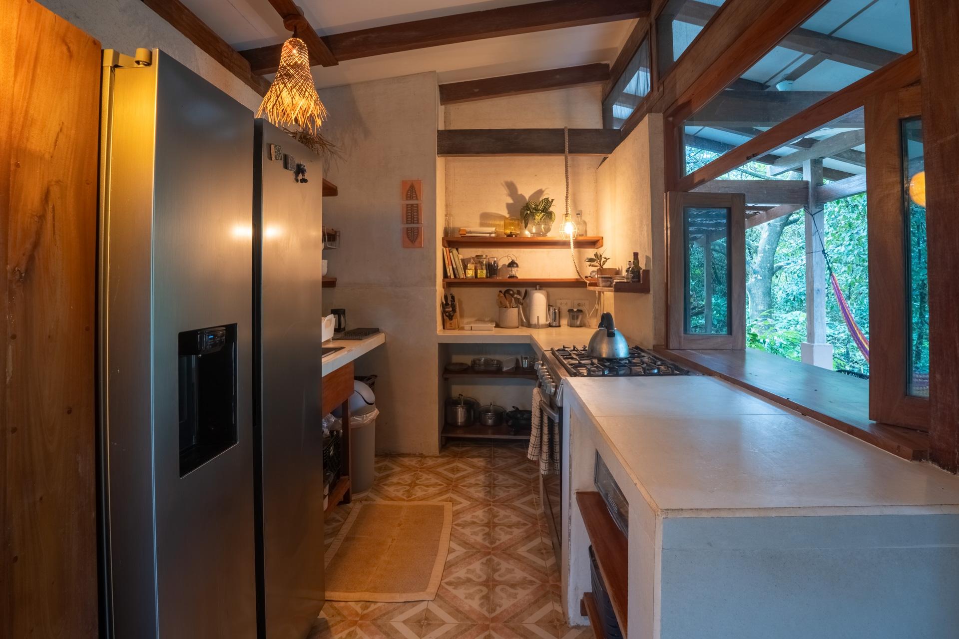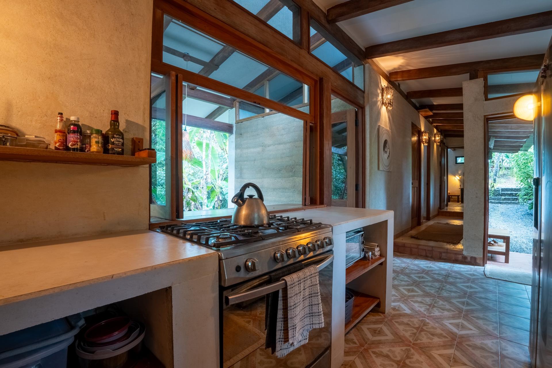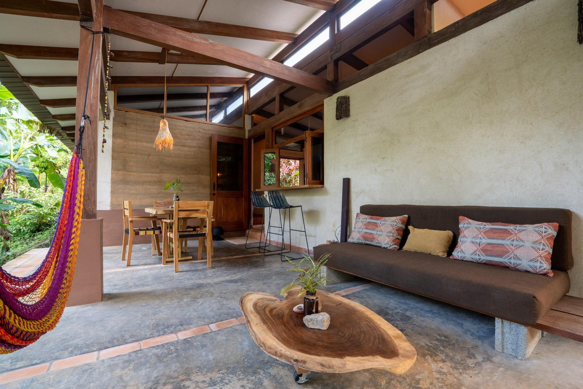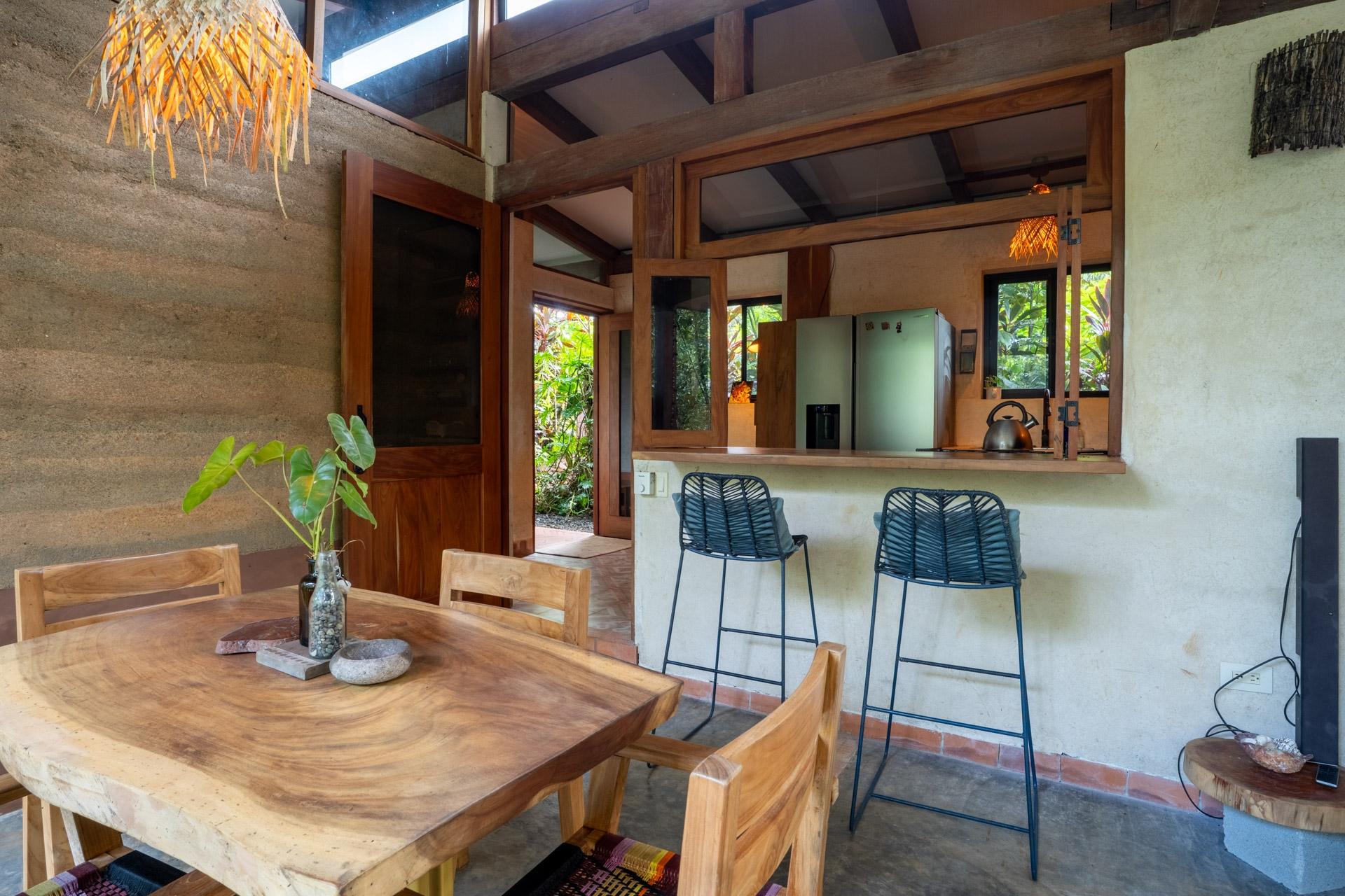 This architect-designed tropical home combines sustainability, comfort, and craftsmanship in a lush forest setting near the coast of Torio, Veraguas. Built in 2021, the home reflects a thoughtful approach to design, blending natural materials with a contemporary tropical layout that invites indoor-outdoor living. Set on a 1,108.65 m² lot within the Torio Hills development, the property features 100 m² of construction, including 3 bedrooms, 1.5 bathrooms, and open, light-filled living areas that connect directly to the surrounding landscape. The home is fully furnished and already operating successfully as a vacation rental, offering immediate income potential and long-term value for those looking to live or invest in one of Panama’s most beautiful coastal regions. Design and Construction The structure was built using rammed earth walls, tropical hardwoods, and limestone finishes, creating a warm, organic feel while maintaining natural temperature balance inside the home. A sandwich zinc roof with exposed beams enhances airflow and natural light, while the earthy tones of the materials blend harmoniously with the surrounding forest. Interior and Layout The interior follows a simple and efficient layout that emphasizes comfort and flow. The semi-open kitchen features a gas stove, open shelving, and direct access to the terrace, creating a seamless transition between cooking, dining, and relaxing. The main bedroom includes high ceilings, built-in storage, and large sliding doors that open to forest views. Two additional bedrooms offer flexible space for guests or family, one of them featuring a full bed below and a lofted twin above.