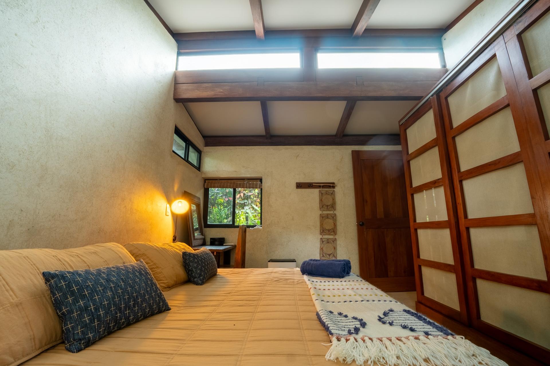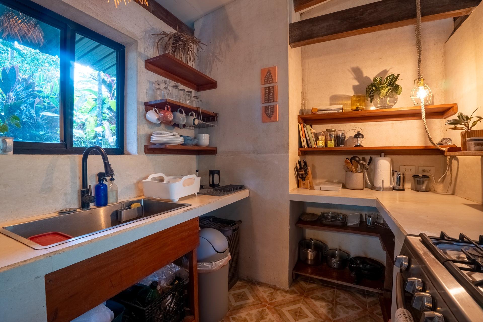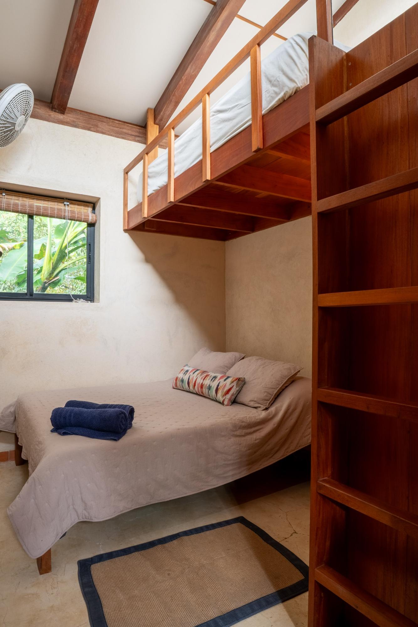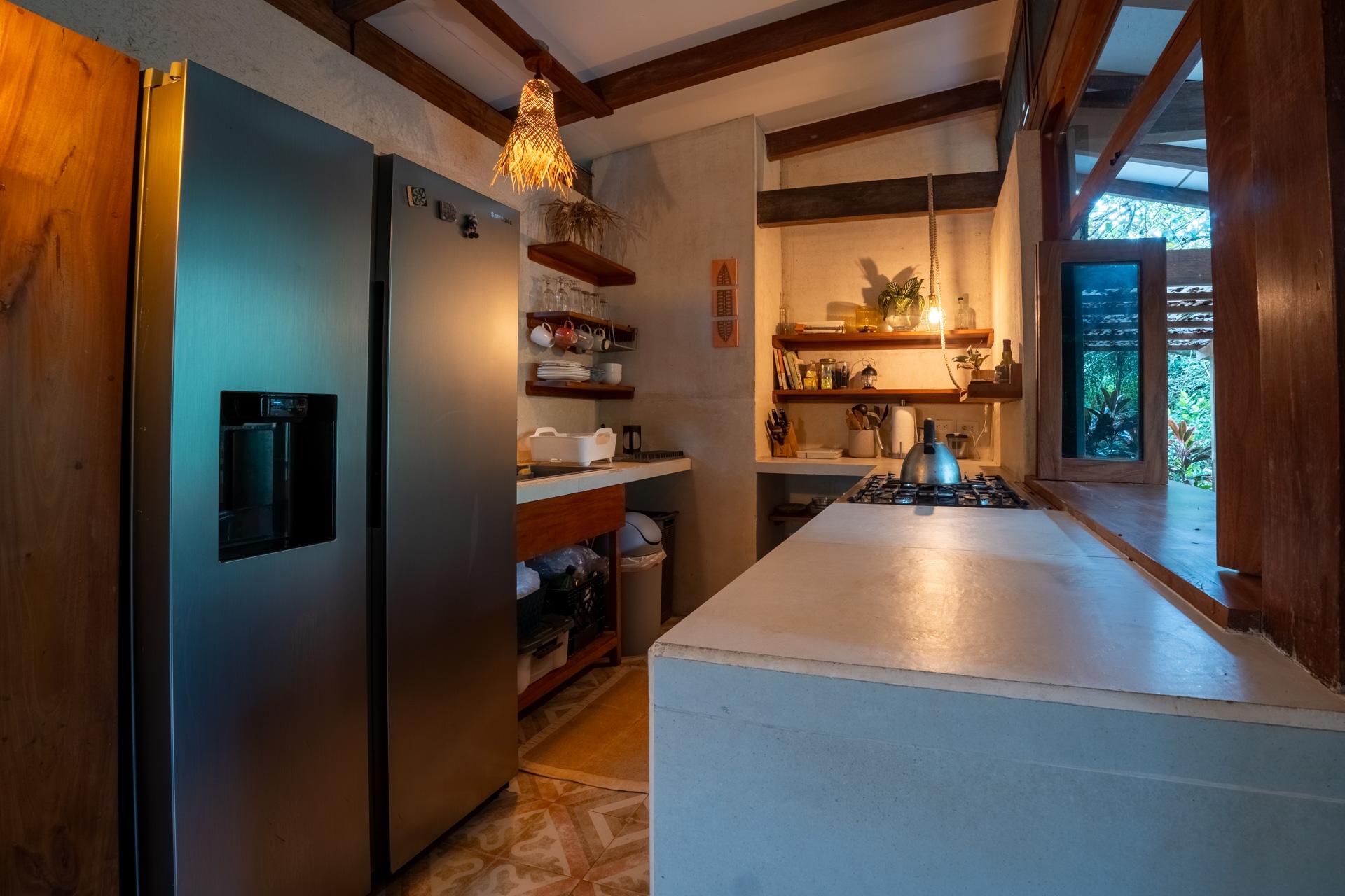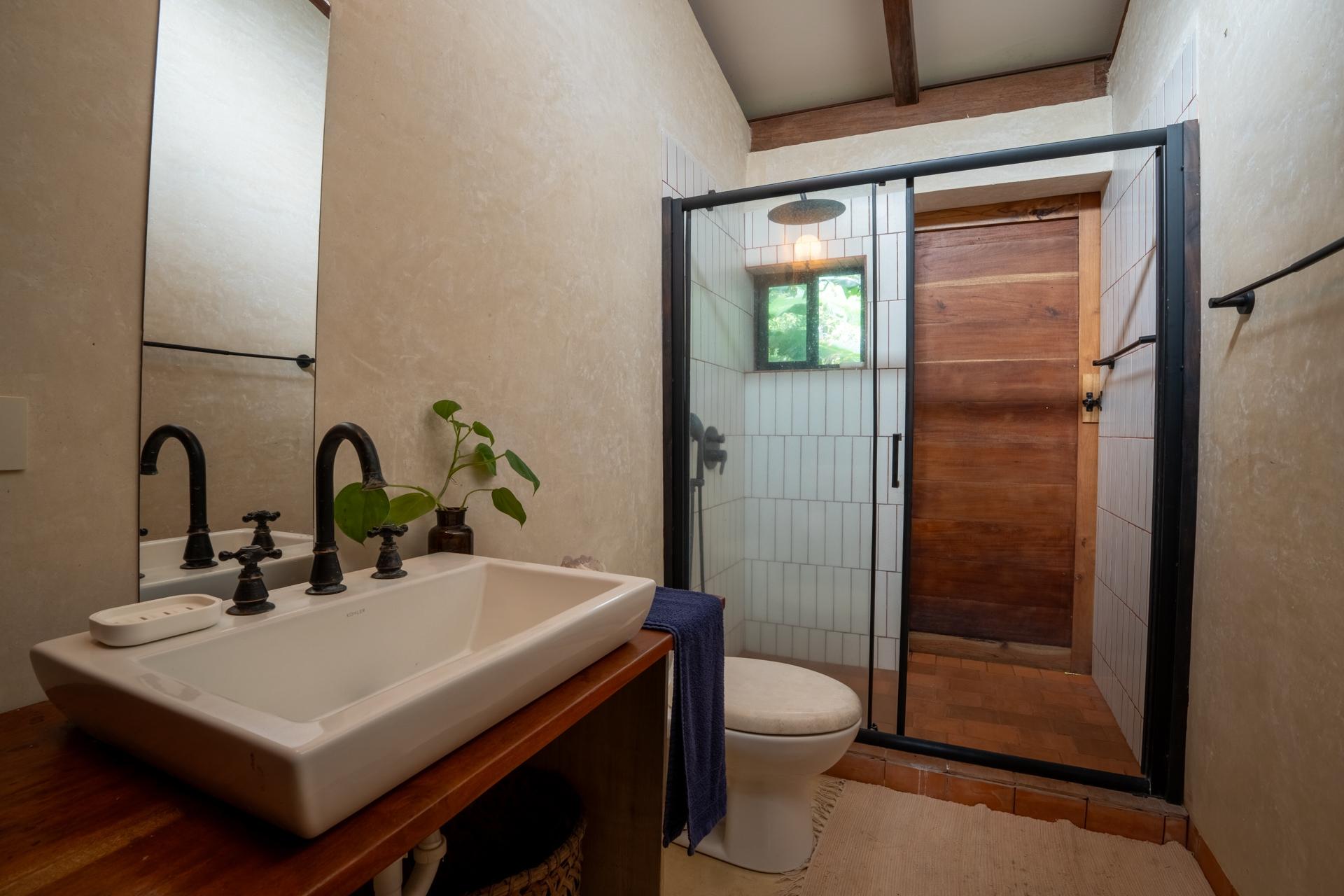 This architect-designed tropical home combines sustainability, comfort, and craftsmanship in a lush forest setting near the coast of Torio, Veraguas. Built in 2021, the home reflects a thoughtful approach to design, blending natural materials with a contemporary tropical layout that invites indoor-outdoor living. Set on a 1,108.65 m² lot within the Torio Hills development, the property features 100 m² of construction, including 3 bedrooms, 1.5 bathrooms, and open, light-filled living areas that connect directly to the surrounding landscape. The home is fully furnished and already operating successfully as a vacation rental, offering immediate income potential and long-term value for those looking to live or invest in one of Panama’s most beautiful coastal regions. Design and Construction The structure was built using rammed earth walls, tropical hardwoods, and limestone finishes, creating a warm, organic feel while maintaining natural temperature balance inside the home. A sandwich zinc roof with exposed beams enhances airflow and natural light, while the earthy tones of the materials blend harmoniously with the surrounding forest. Interior and Layout The interior follows a simple and efficient layout that emphasizes comfort and flow. The semi-open kitchen features a gas stove, open shelving, and direct access to the terrace, creating a seamless transition between cooking, dining, and relaxing. The main bedroom includes high ceilings, built-in storage, and large sliding doors that open to forest views. Two additional bedrooms offer flexible space for guests or family, one of them featuring a full bed below and a lofted twin above.
