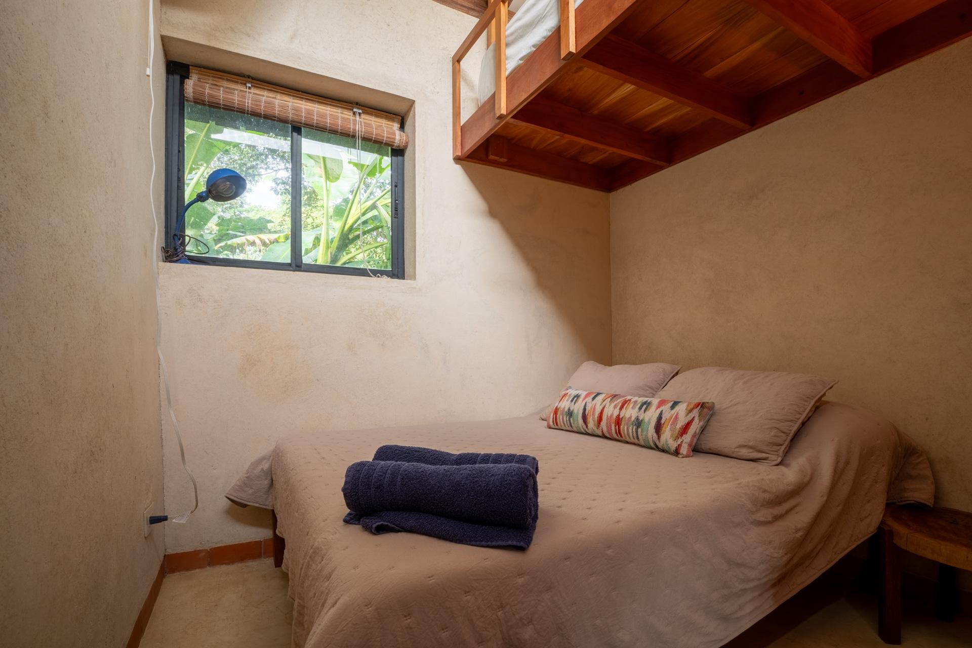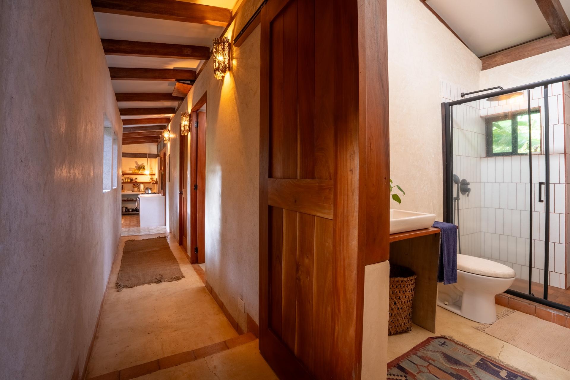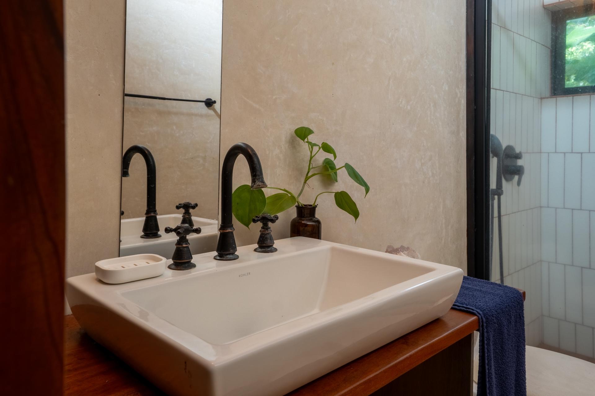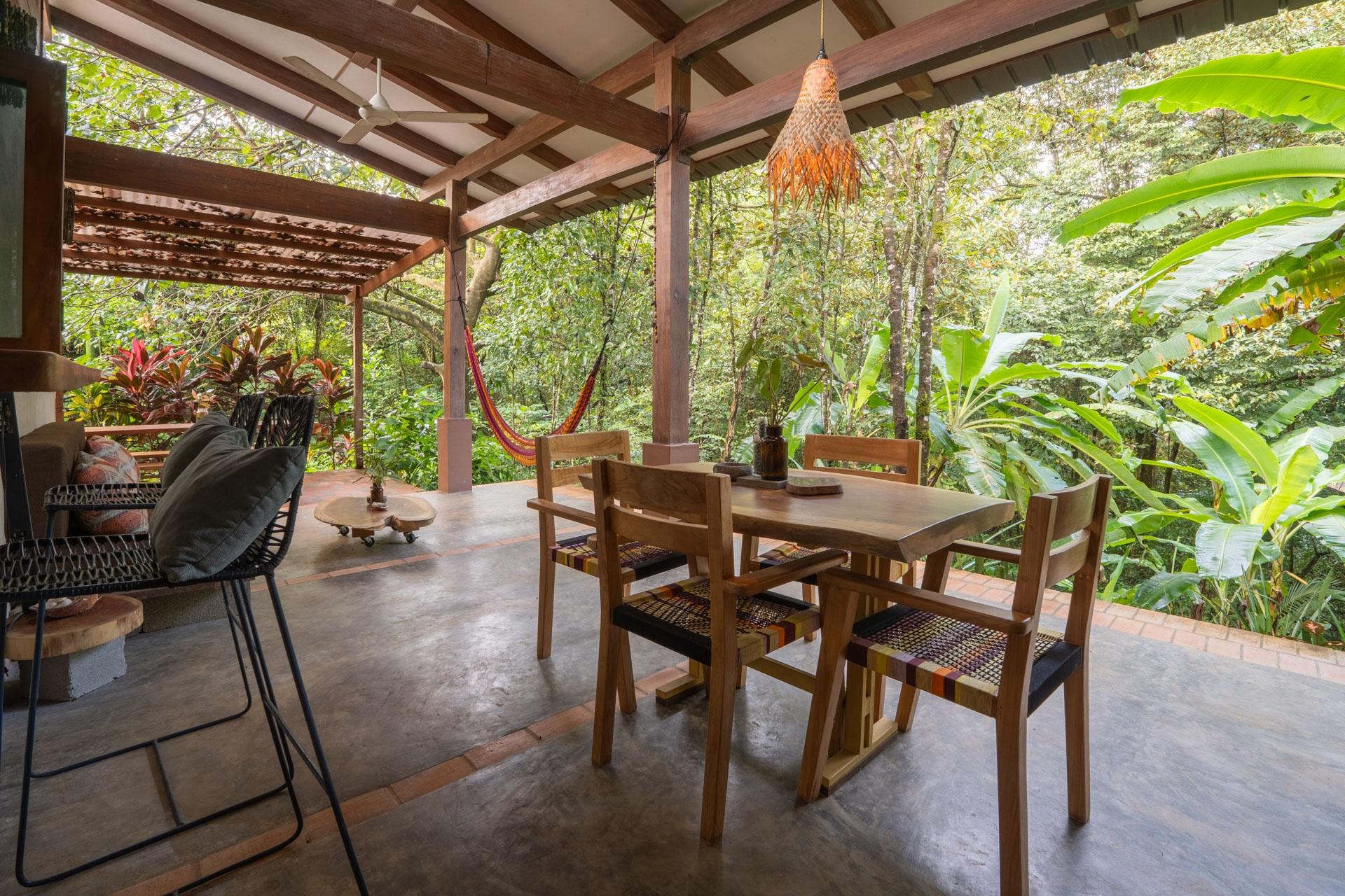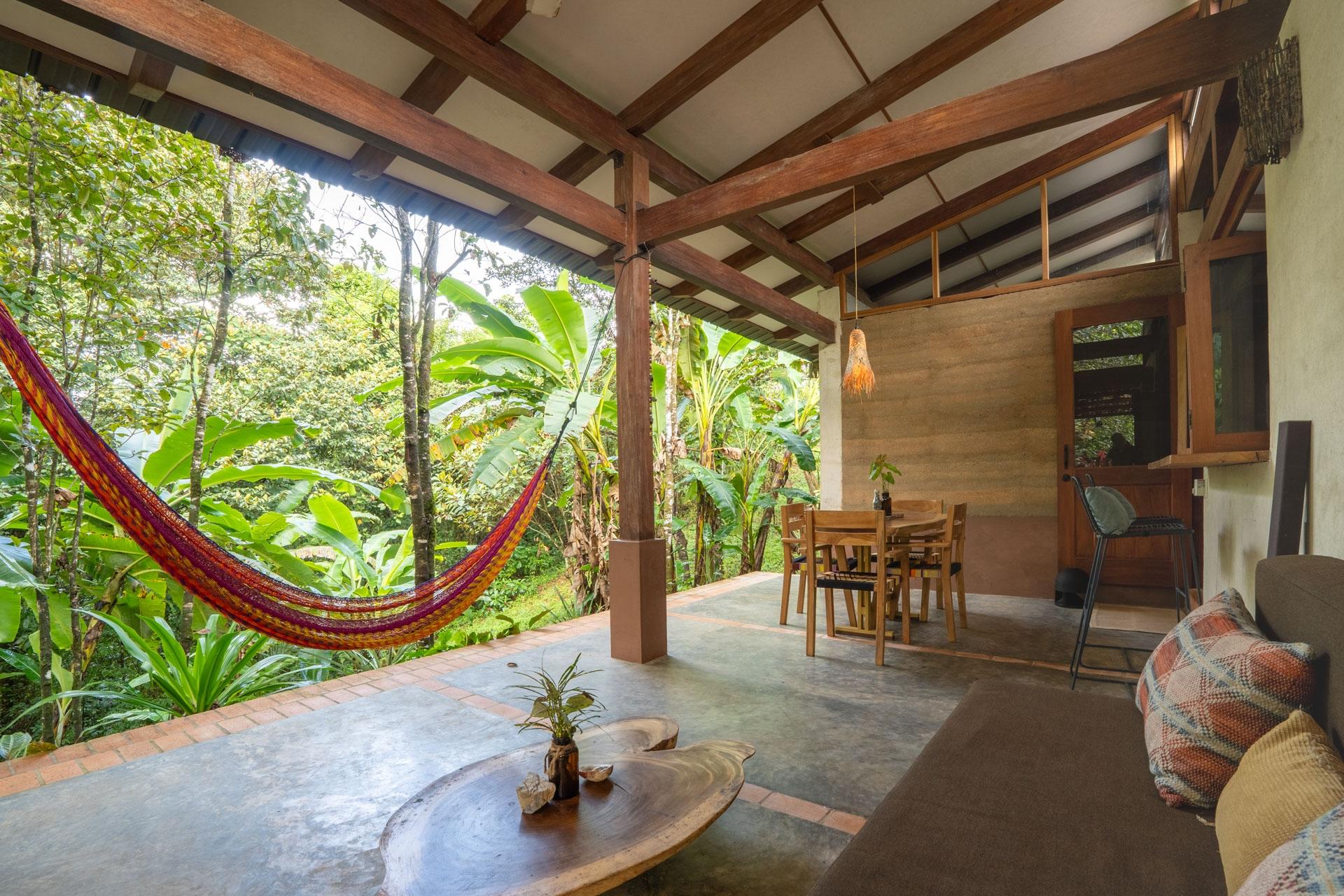 This architect-designed tropical home combines sustainability, comfort, and craftsmanship in a lush forest setting near the coast of Torio, Veraguas. Built in 2021, the home reflects a thoughtful approach to design, blending natural materials with a contemporary tropical layout that invites indoor-outdoor living. Set on a 1,108.65 m² lot within the Torio Hills development, the property features 100 m² of construction, including 3 bedrooms, 1.5 bathrooms, and open, light-filled living areas that connect directly to the surrounding landscape. The home is fully furnished and already operating successfully as a vacation rental, offering immediate income potential and long-term value for those looking to live or invest in one of Panama’s most beautiful coastal regions. Design and Construction The structure was built using rammed earth walls, tropical hardwoods, and limestone finishes, creating a warm, organic feel while maintaining natural temperature balance inside the home. A sandwich zinc roof with exposed beams enhances airflow and natural light, while the earthy tones of the materials blend harmoniously with the surrounding forest. Interior and Layout The interior follows a simple and efficient layout that emphasizes comfort and flow. The semi-open kitchen features a gas stove, open shelving, and direct access to the terrace, creating a seamless transition between cooking, dining, and relaxing. The main bedroom includes high ceilings, built-in storage, and large sliding doors that open to forest views. Two additional bedrooms offer flexible space for guests or family, one of them featuring a full bed below and a lofted twin above.