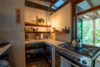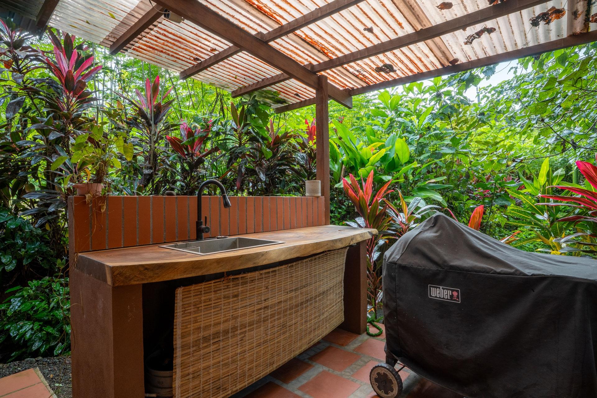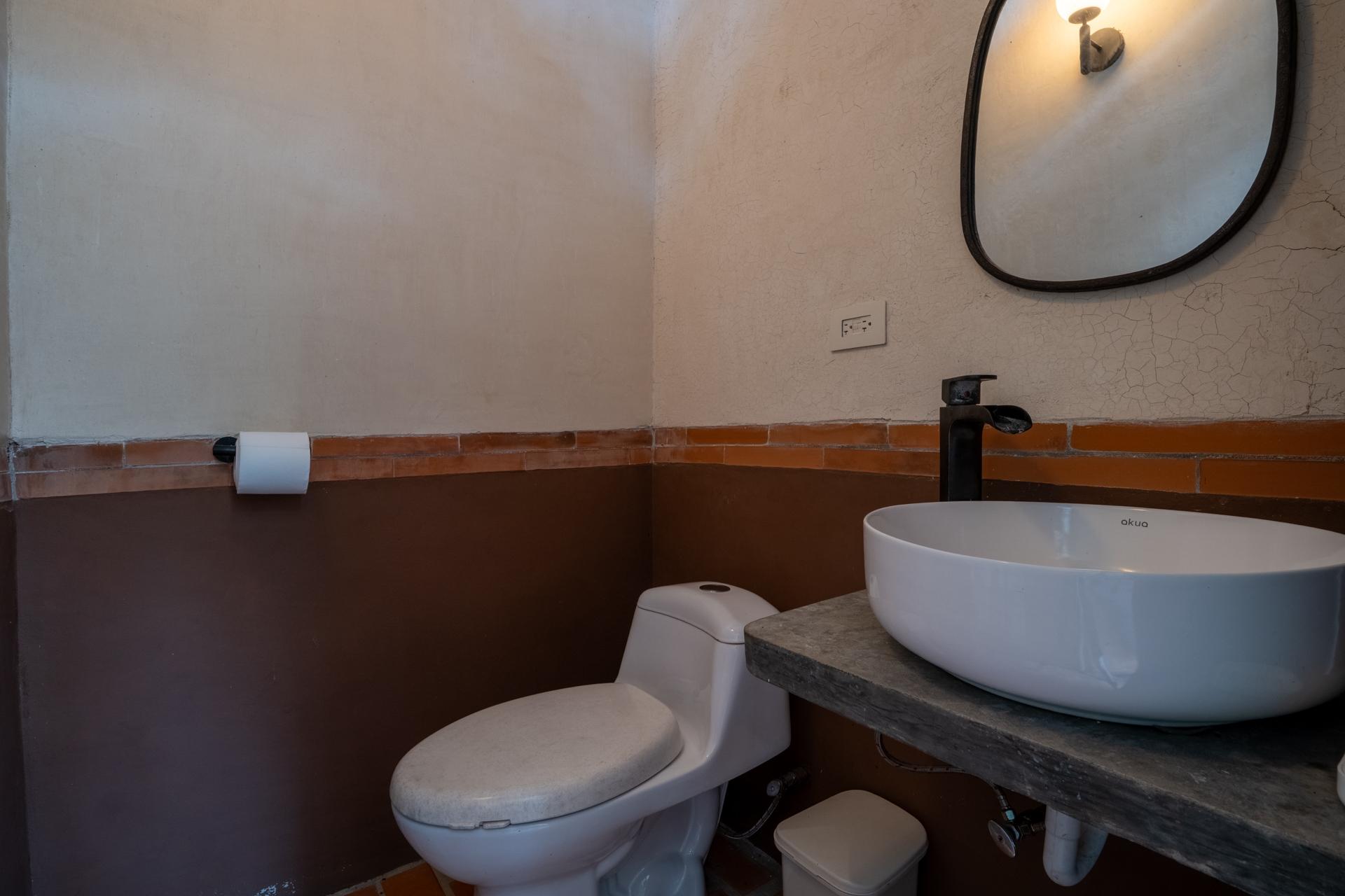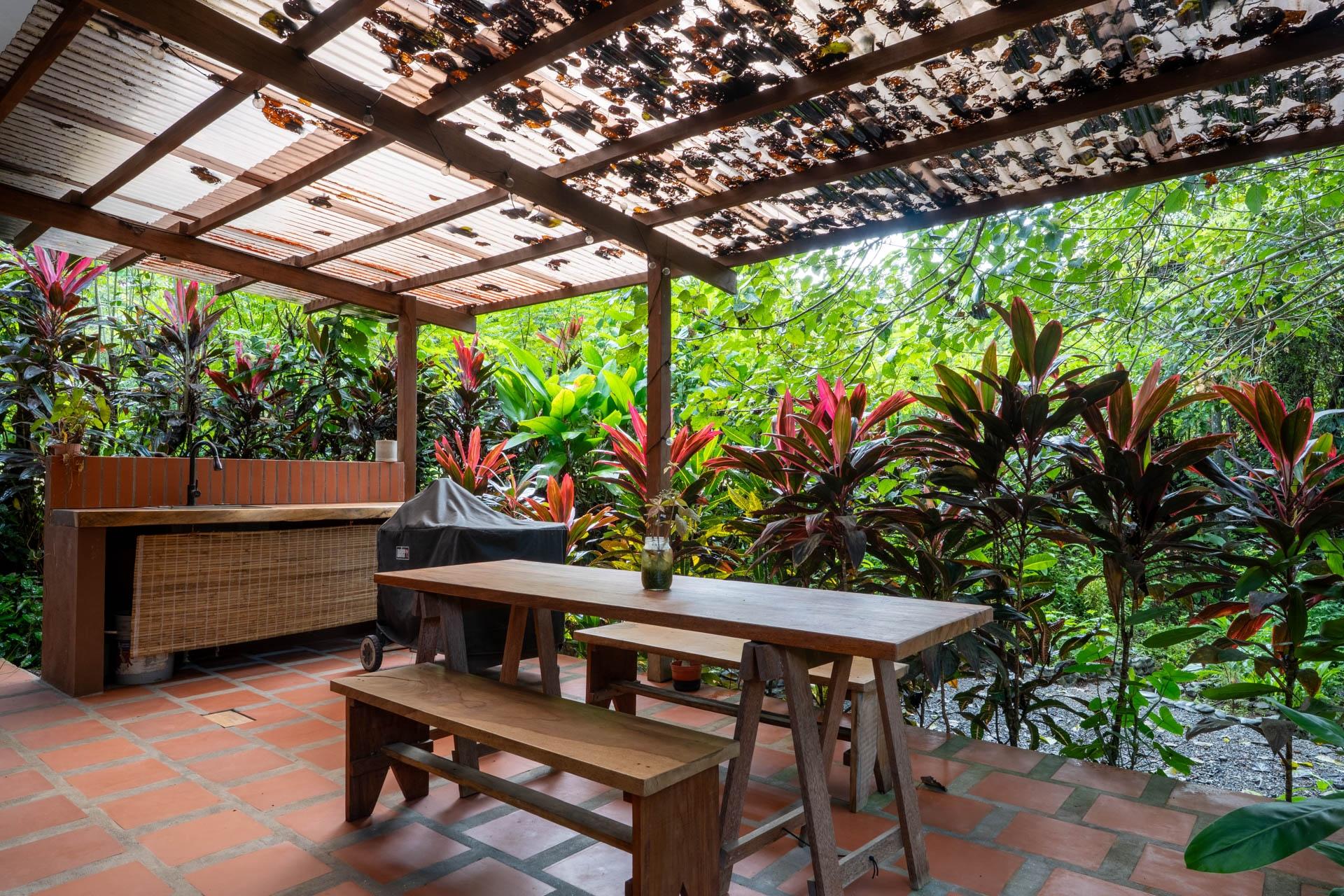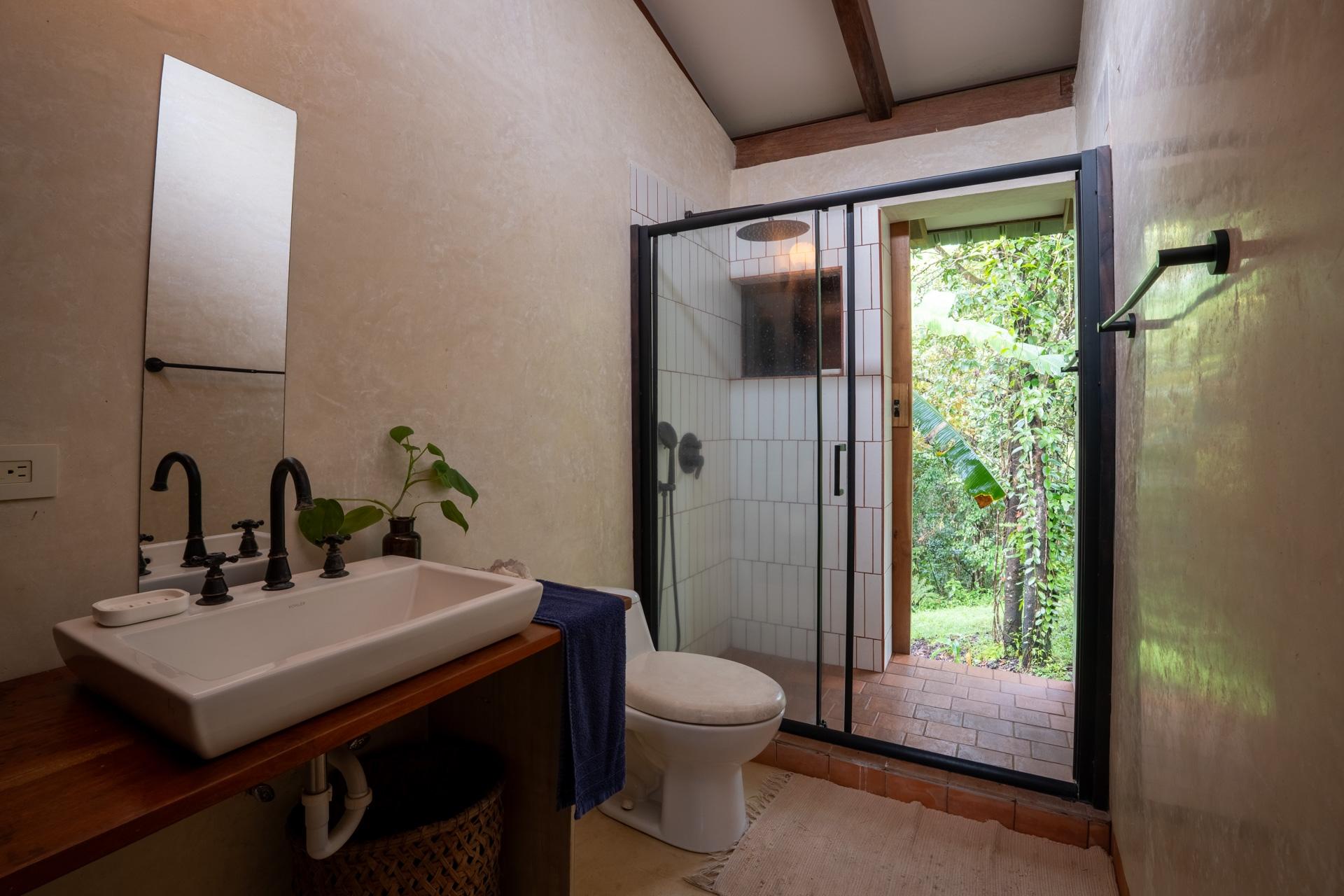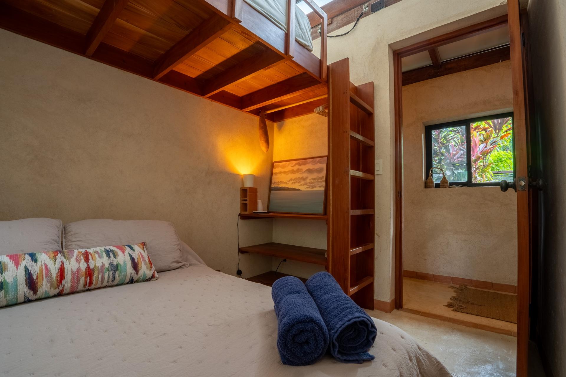 This architect-designed tropical home combines sustainability, comfort, and craftsmanship in a lush forest setting near the coast of Torio, Veraguas. Built in 2021, the home reflects a thoughtful approach to design, blending natural materials with a contemporary tropical layout that invites indoor-outdoor living. Set on a 1,108.65 m² lot within the Torio Hills development, the property features 100 m² of construction, including 3 bedrooms, 1.5 bathrooms, and open, light-filled living areas that connect directly to the surrounding landscape. The home is fully furnished and already operating successfully as a vacation rental, offering immediate income potential and long-term value for those looking to live or invest in one of Panama’s most beautiful coastal regions. Design and Construction The structure was built using rammed earth walls, tropical hardwoods, and limestone finishes, creating a warm, organic feel while maintaining natural temperature balance inside the home. A sandwich zinc roof with exposed beams enhances airflow and natural light, while the earthy tones of the materials blend harmoniously with the surrounding forest. Interior and Layout The interior follows a simple and efficient layout that emphasizes comfort and flow. The semi-open kitchen features a gas stove, open shelving, and direct access to the terrace, creating a seamless transition between cooking, dining, and relaxing. The main bedroom includes high ceilings, built-in storage, and large sliding doors that open to forest views. Two additional bedrooms offer flexible space for guests or family, one of them featuring a full bed below and a lofted twin above.