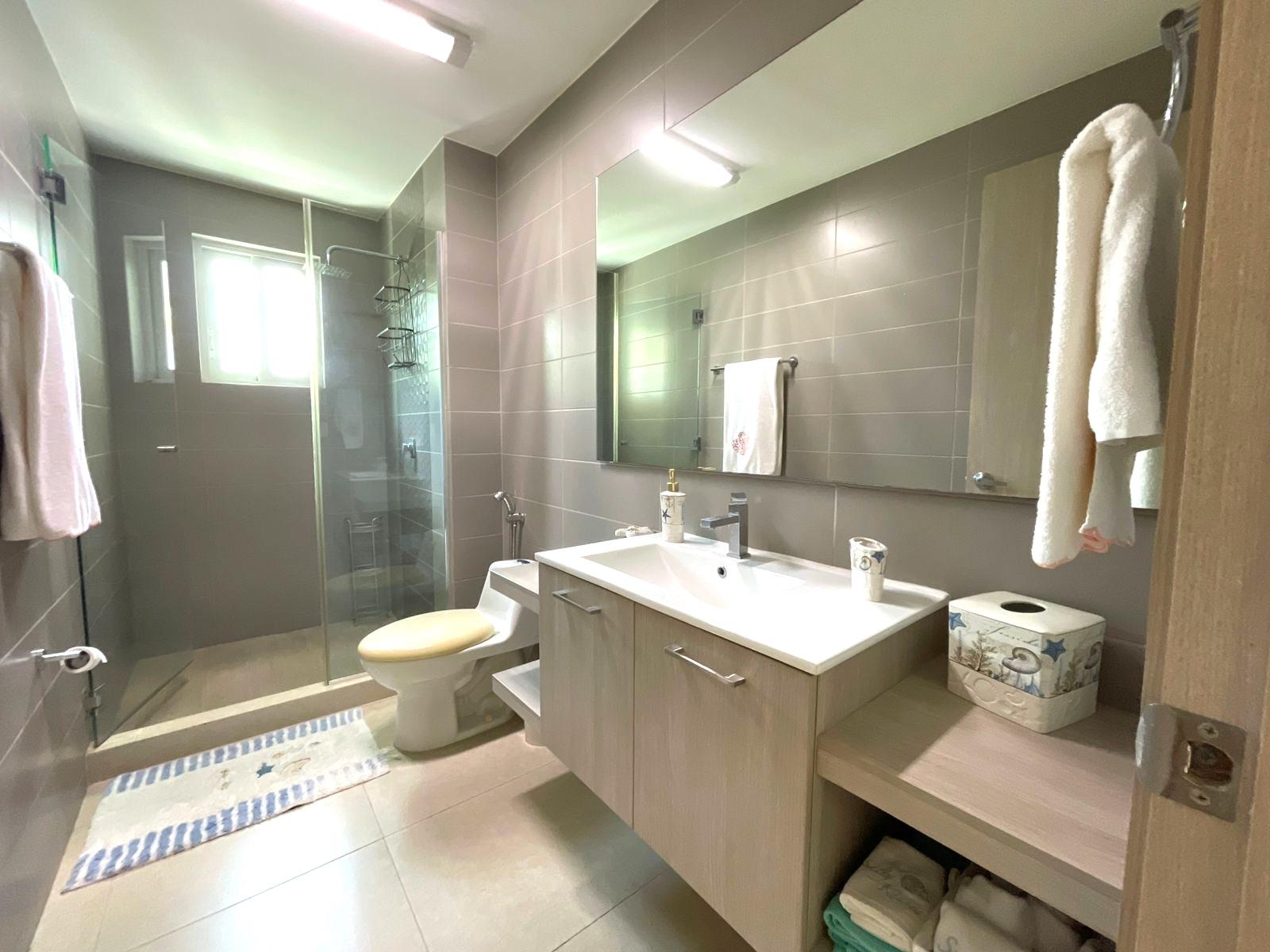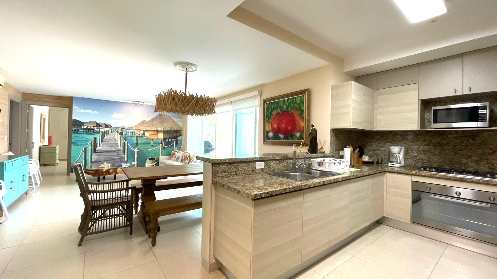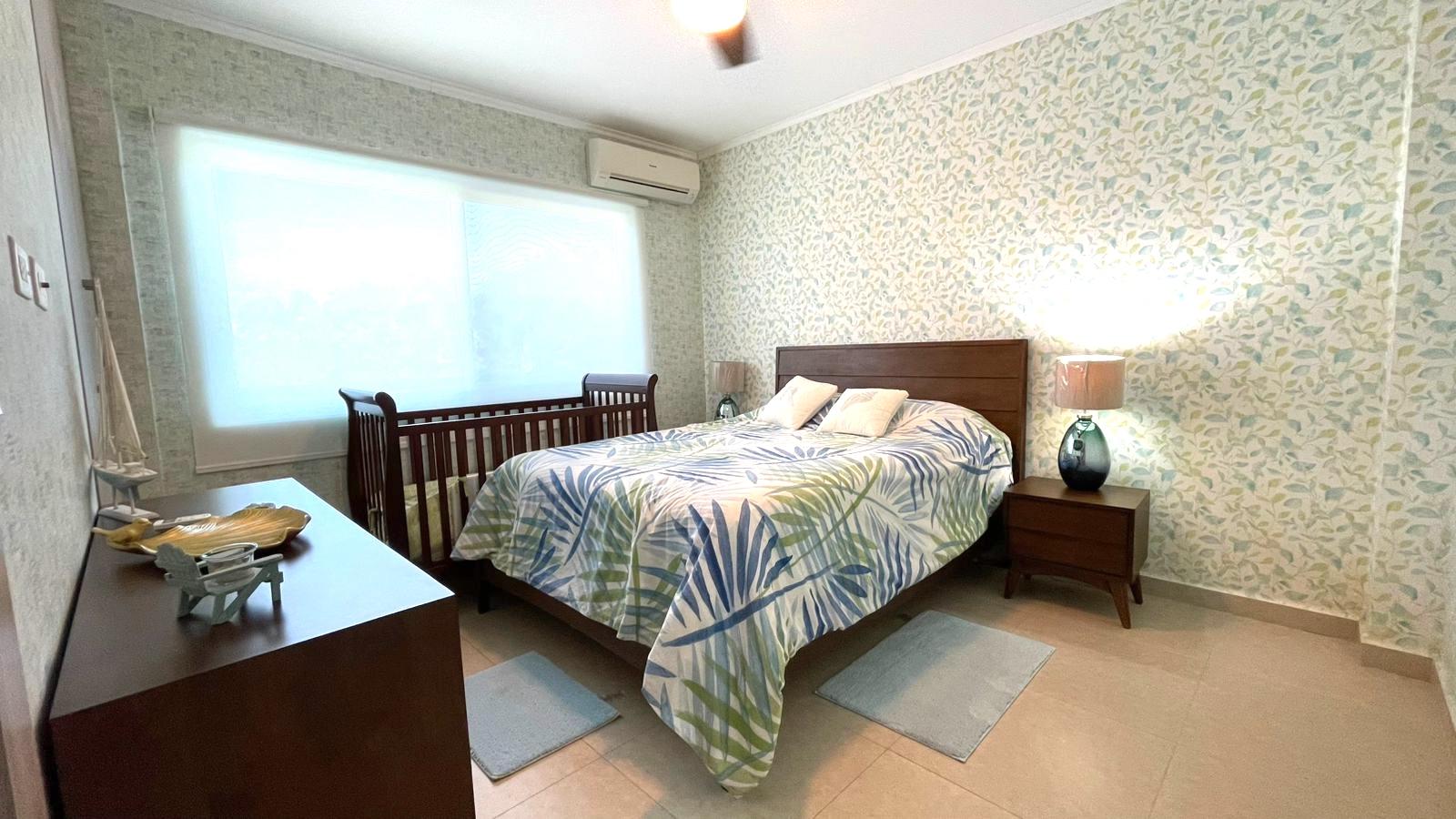 The apartment is in excellent condition, featuring three spacious bedrooms, each with its own bathroom, a maid's quarters with bathroom, an open kitchen, a living/dining room, a laundry area, and a balcony terrace. The apartment is finely furnished, with five Panasonic inverter split air conditioners, and the price includes all appliances, curtains, and furniture. Bijao Beach Club & Residences is a residential, vacation, and tourist complex located on Panama's Pacific coast. It offers a mix of apartments, houses, and villas, along with exclusive access to beaches, golf courses, swimming pools, and various recreational facilities. It is a popular destination for both residents and visitors seeking a beach setting with high-end services and amenities.