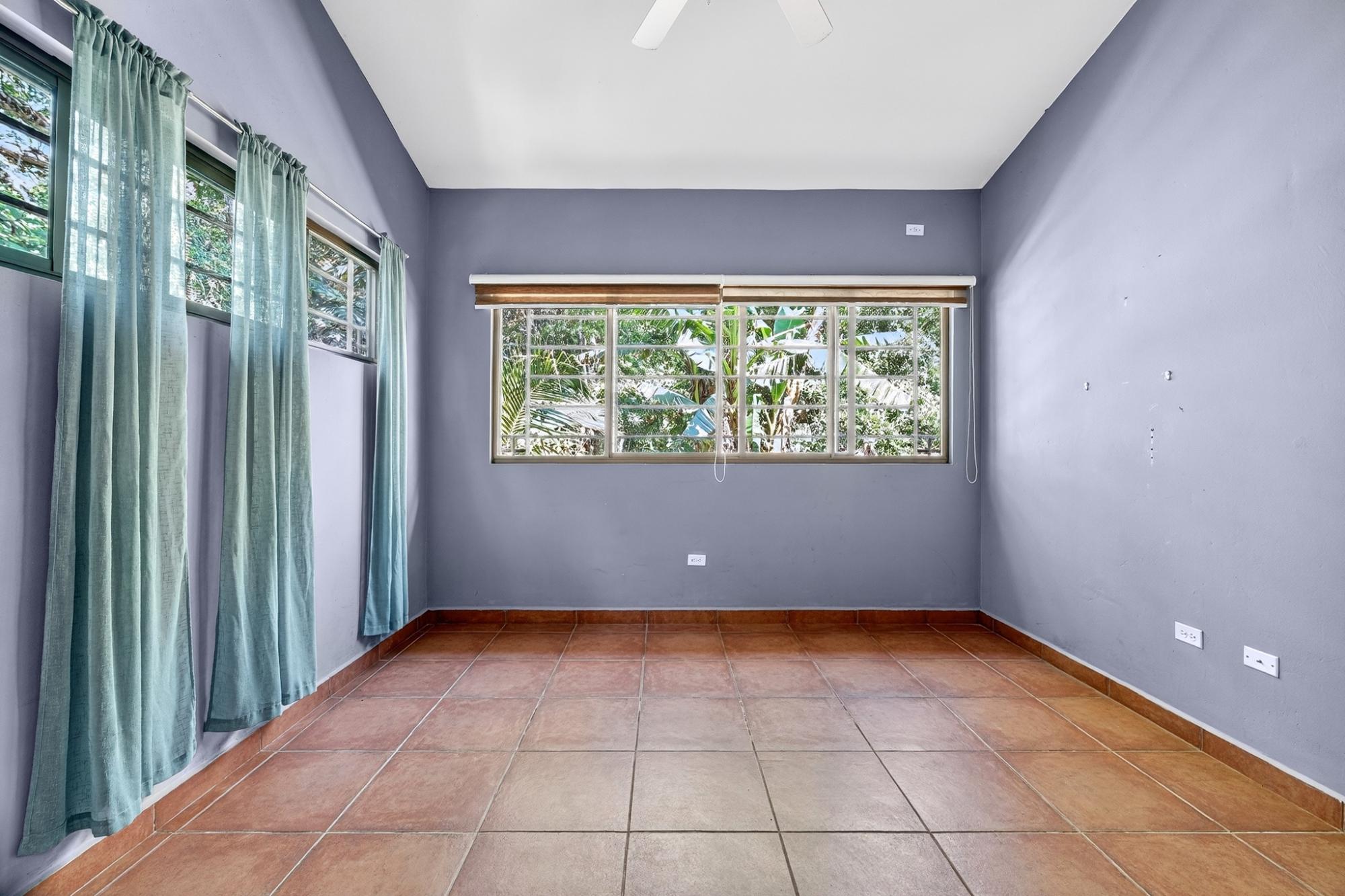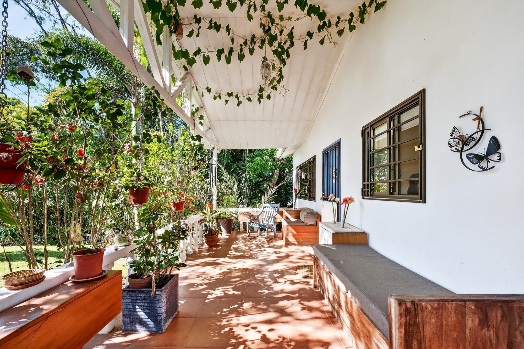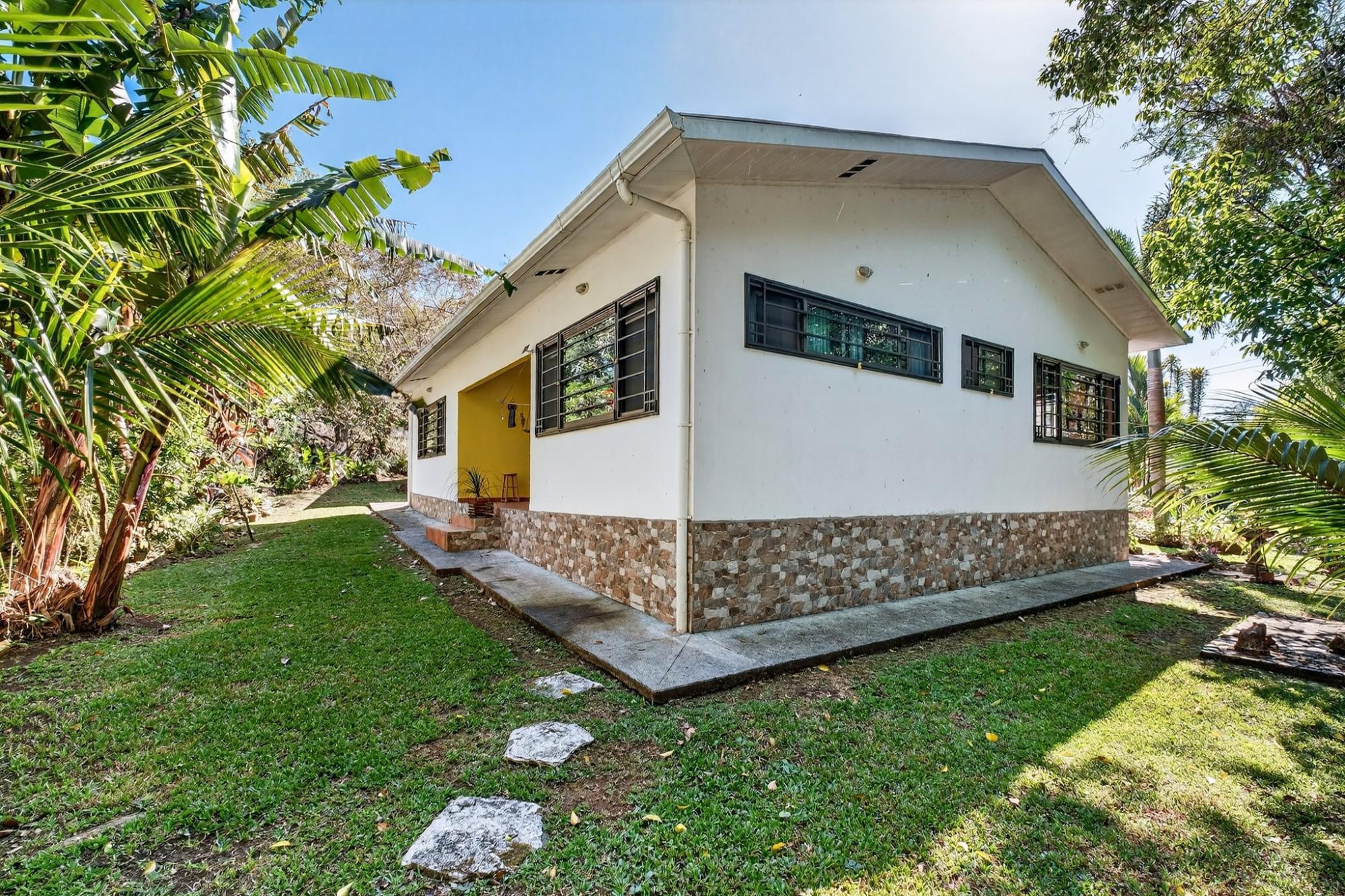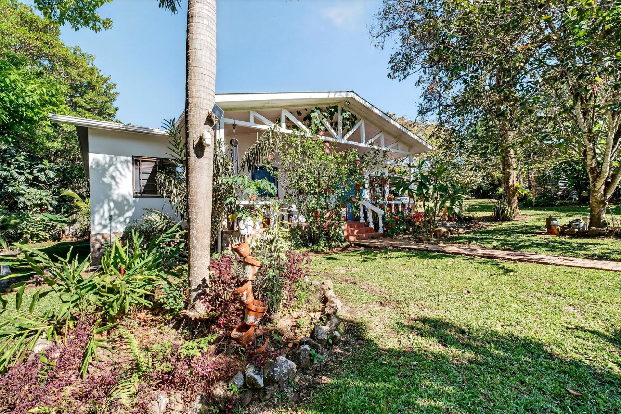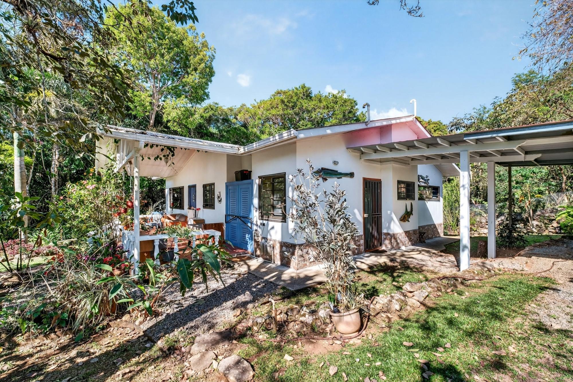 Charming 2BR/2BA garden home in desirable Potrerillos, set on a fully usable 1,000 m² lot surrounded by mature tropical landscaping and mountain views. The wide covered front veranda, wrapped in flowering vines, offers ideal year-round outdoor living. Inside, approximately 1,145 sq ft of open-concept living connects the kitchen, dining, and living areas, filled with natural light and garden views. The kitchen features ample cabinetry, tiled counters, and a central island. Two spacious bedrooms provide flexibility for guests or home office use. A large covered side terrace adds additional outdoor entertaining space, and a detached storage structure offers practical convenience. Located in a welcoming area known for its strong international presence and established expat community, just minutes from town amenities. Ideal as a full-time residence, retreat, or investment opportunity.