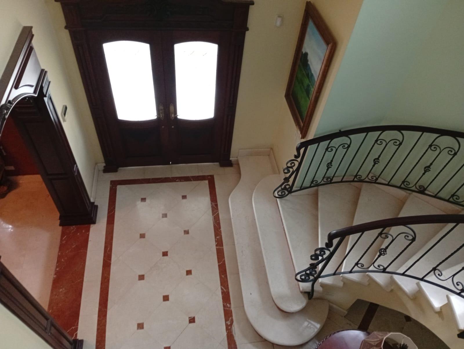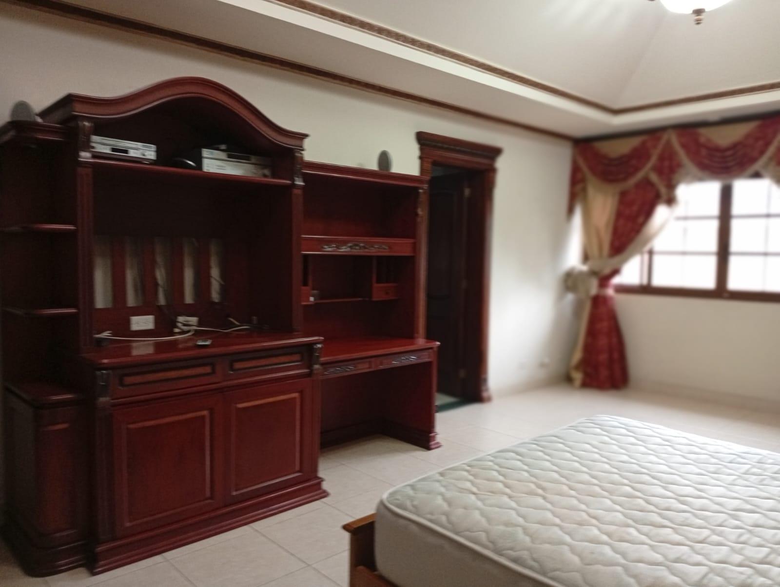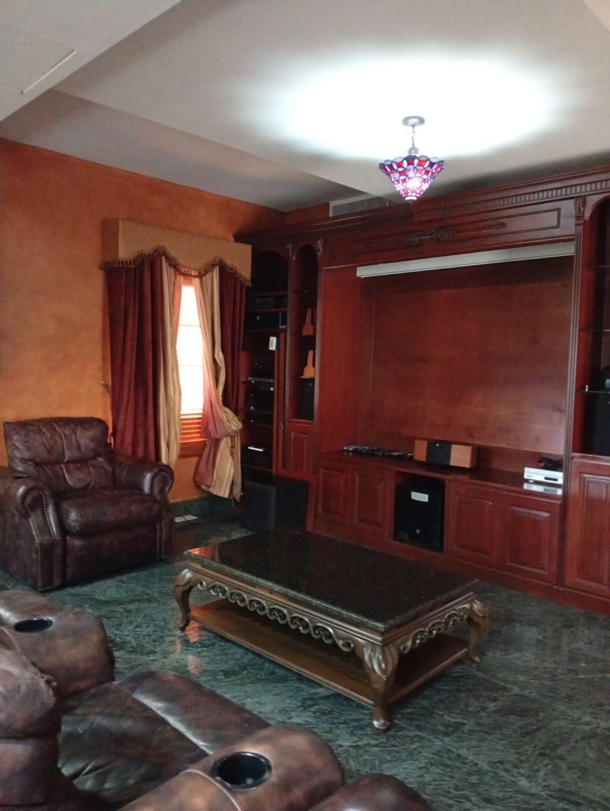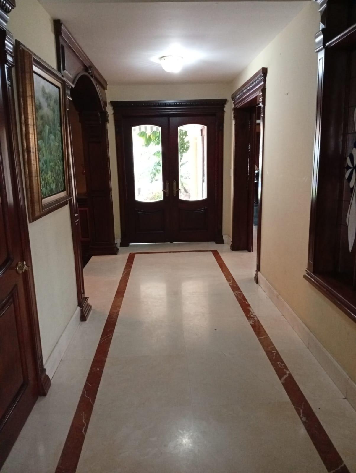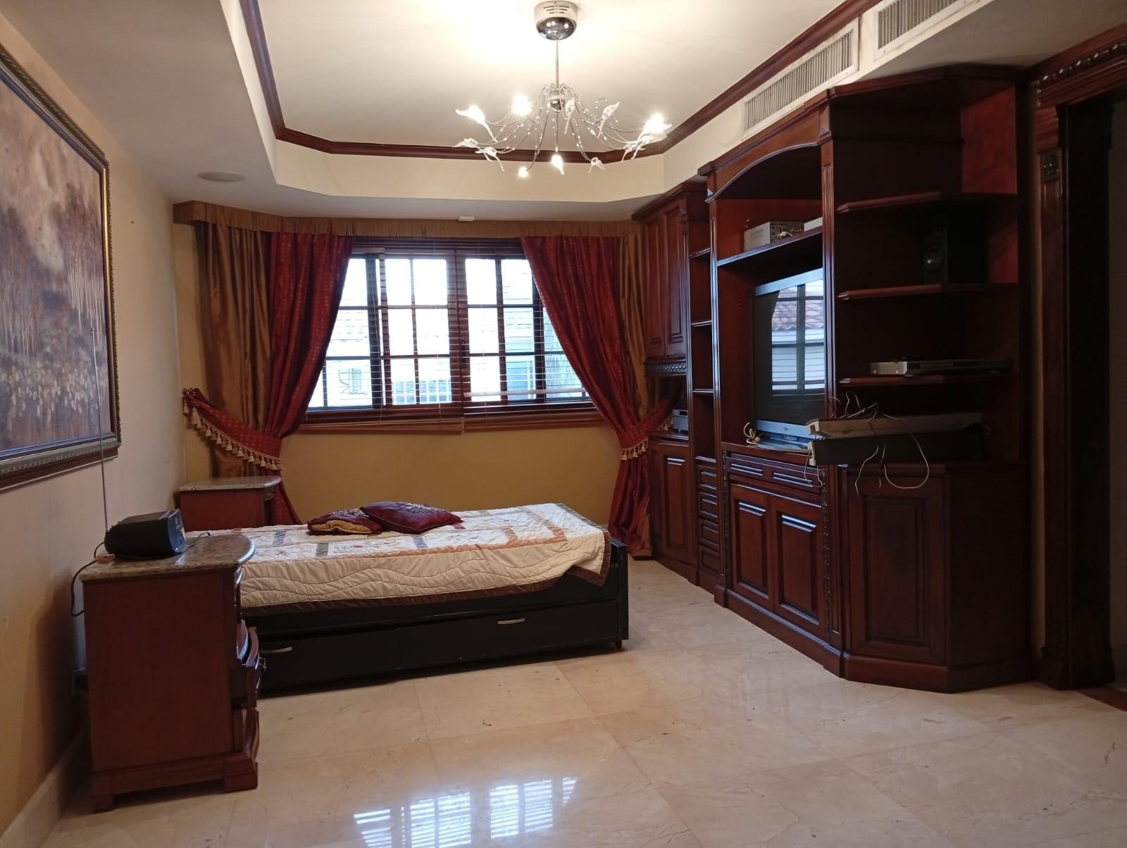 This three-level residence features a living and dining room, a spacious kitchen, a den/bar, a recreation area, five bedrooms, six bathrooms, a jacuzzi, a sauna, storage rooms, and a study. It is the only three-story home in this exclusive gated community. The property includes an indoor pool that requires maintenance. The community also offers a social area with soccer and basketball courts, a swimming pool, and a party area.