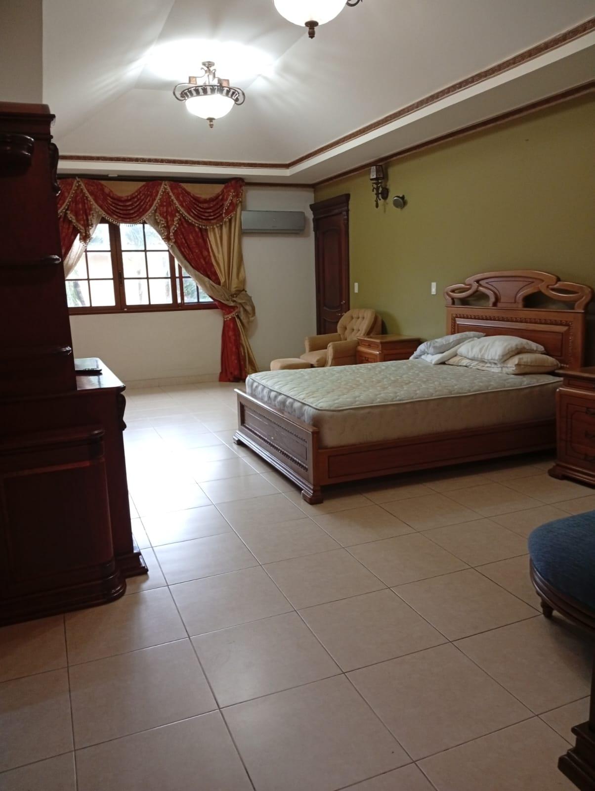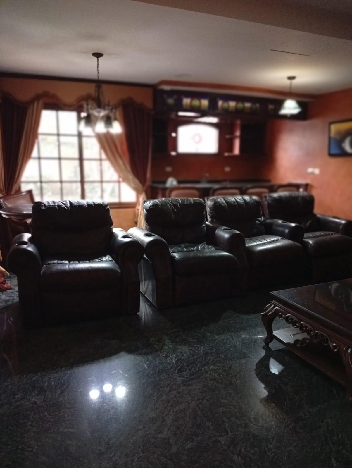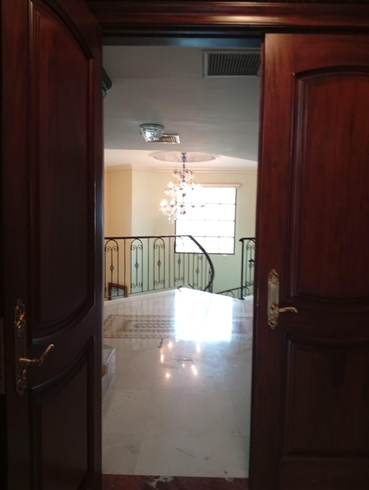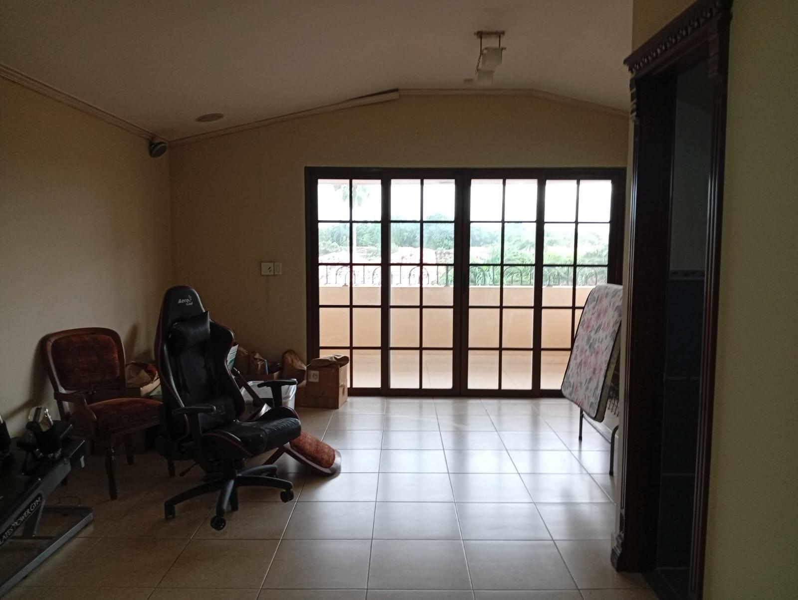 This three-level residence features a living and dining room, a spacious kitchen, a den/bar, a recreation area, five bedrooms, six bathrooms, a jacuzzi, a sauna, storage rooms, and a study. It is the only three-story home in this exclusive gated community. The property includes an indoor pool that requires maintenance. The community also offers a social area with soccer and basketball courts, a swimming pool, and a party area.