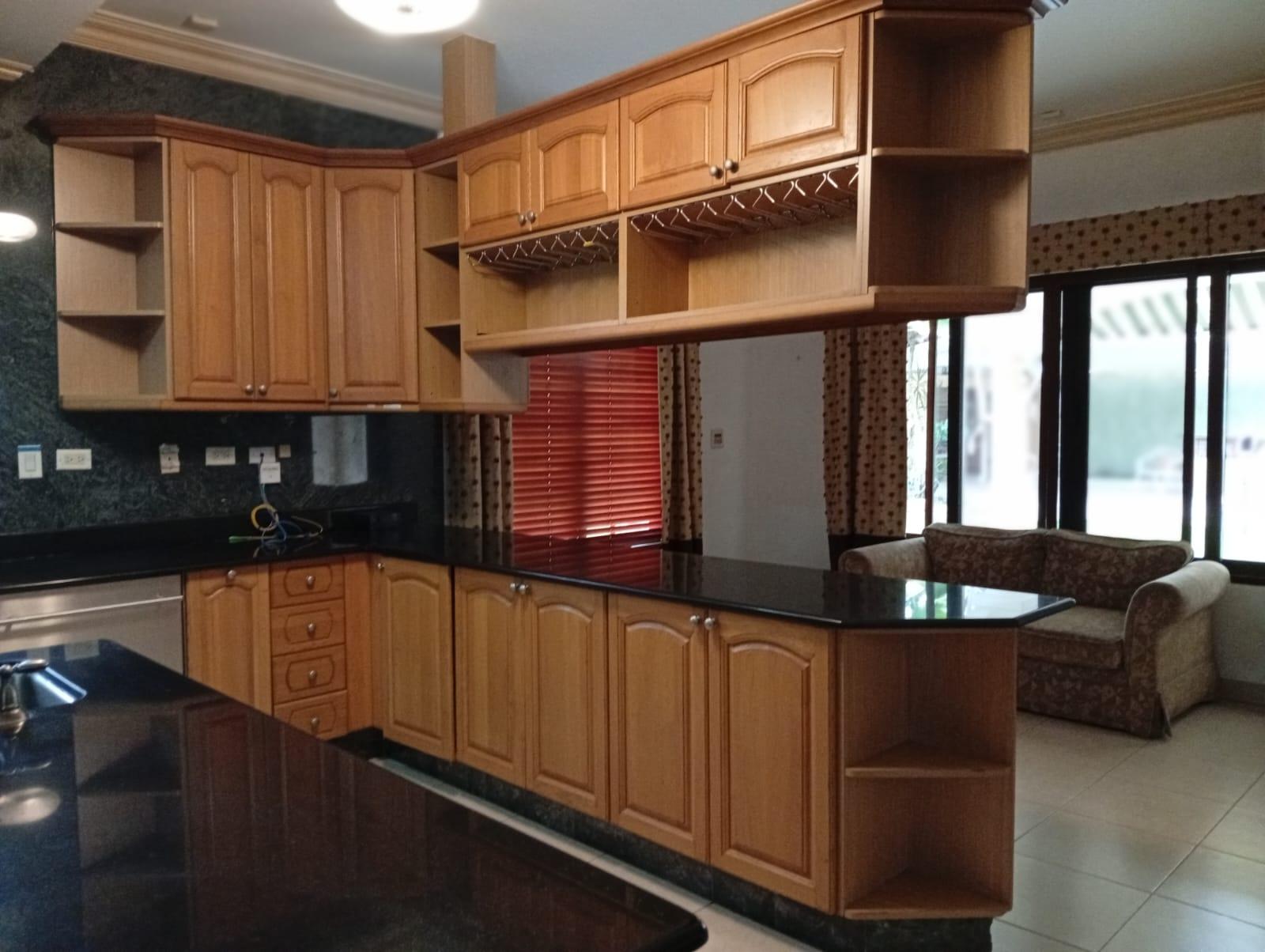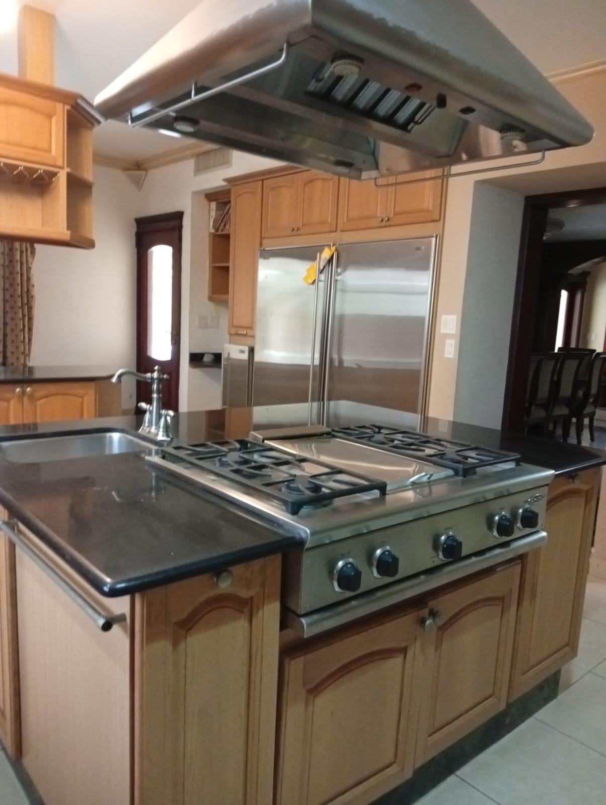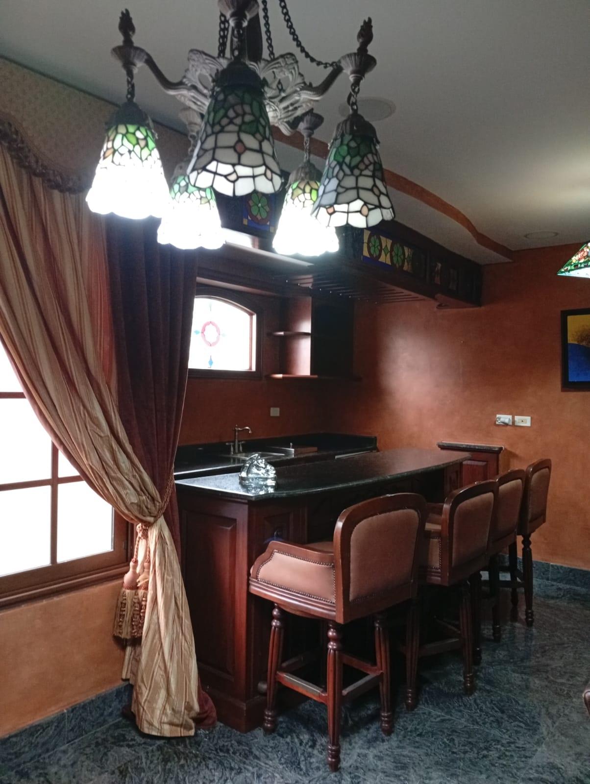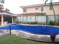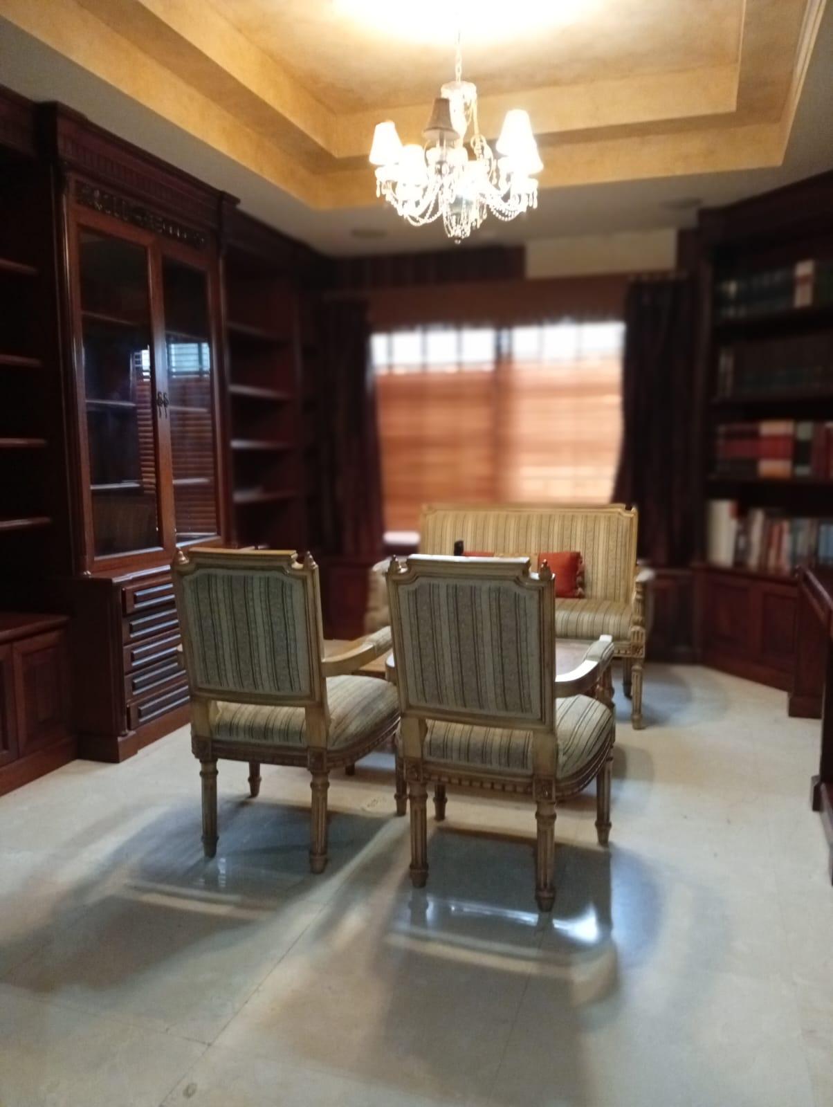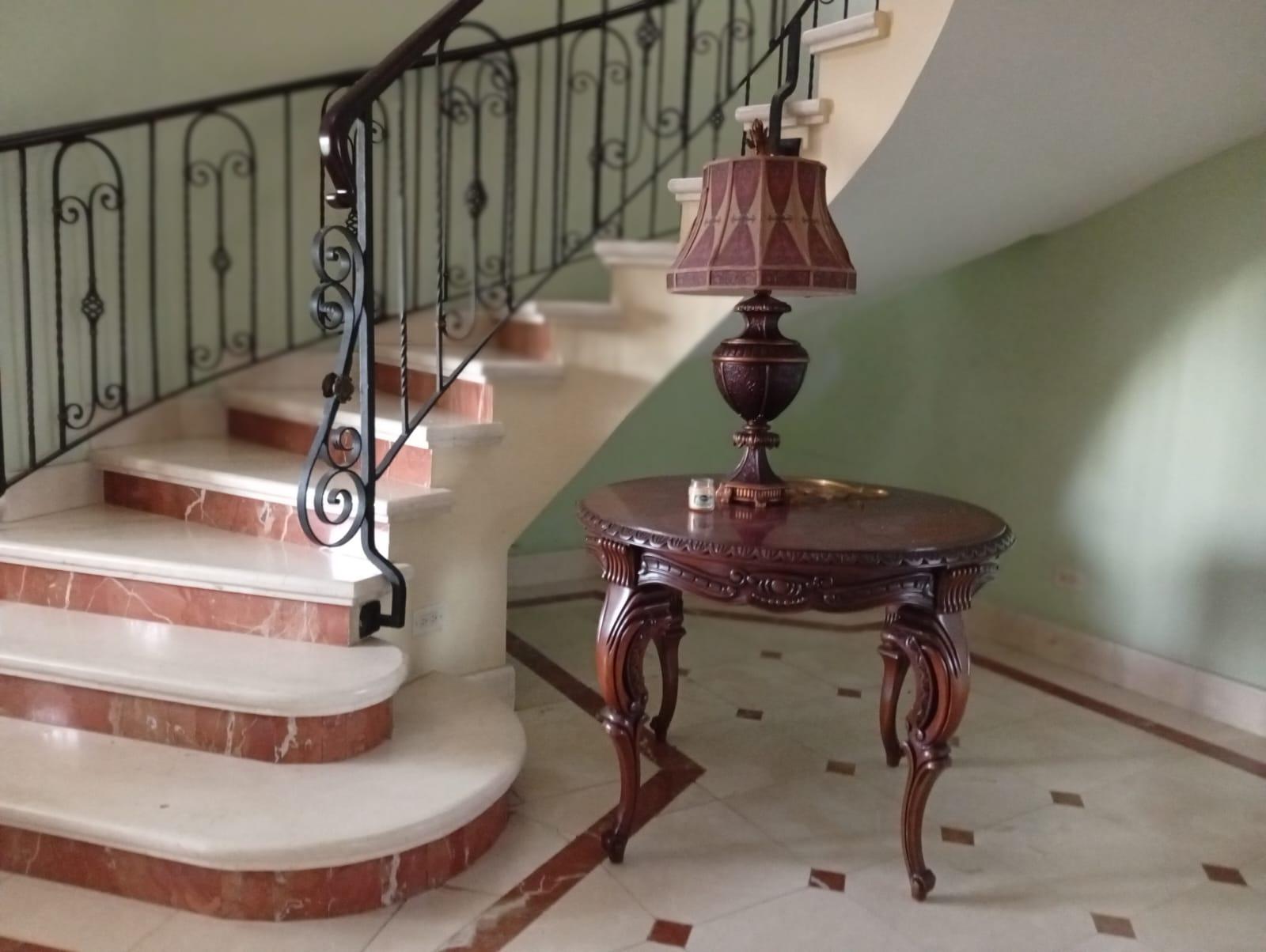 This three-level residence features a living and dining room, a spacious kitchen, a den/bar, a recreation area, five bedrooms, six bathrooms, a jacuzzi, a sauna, storage rooms, and a study. It is the only three-story home in this exclusive gated community. The property includes an indoor pool that requires maintenance. The community also offers a social area with soccer and basketball courts, a swimming pool, and a party area.