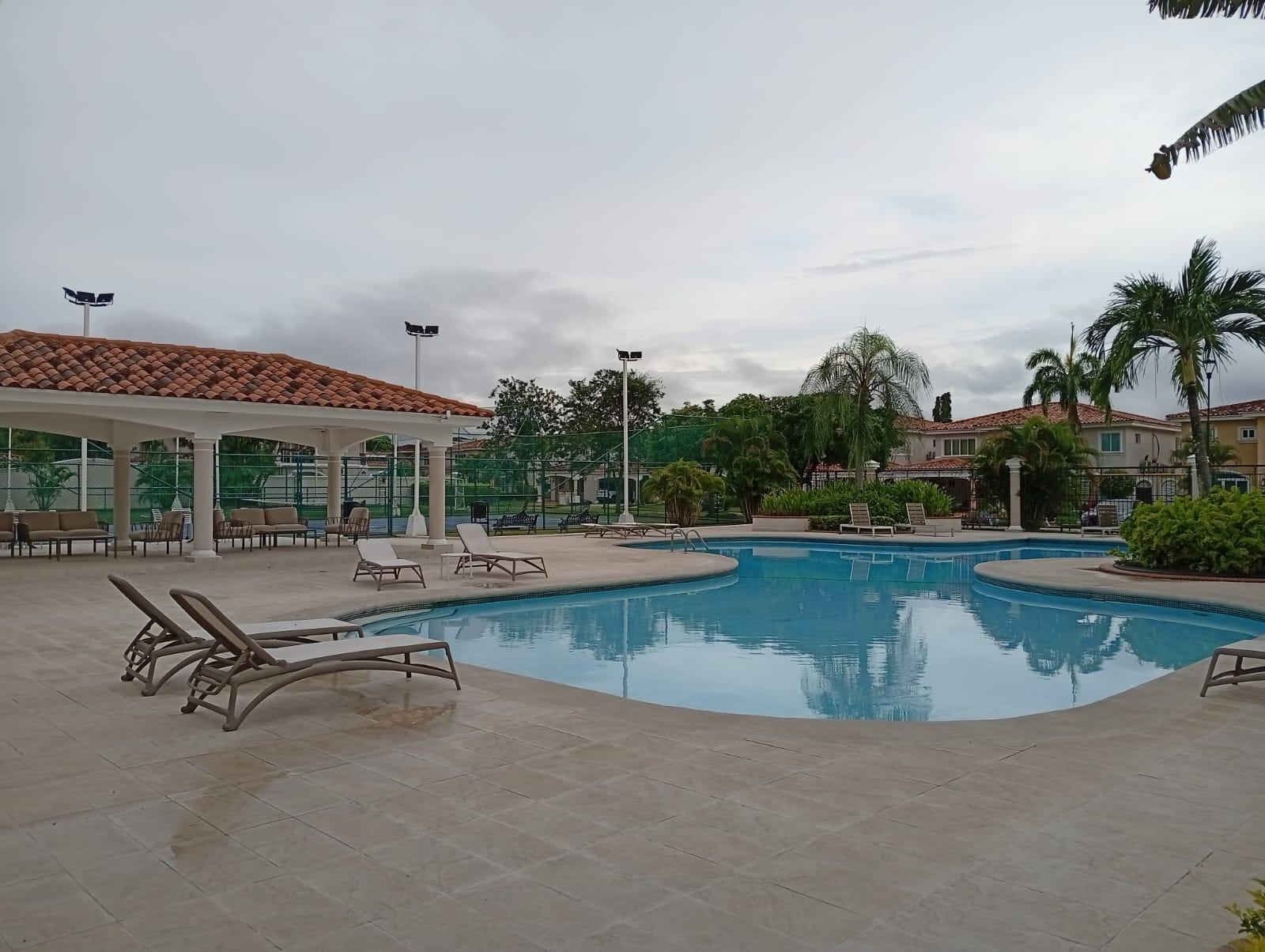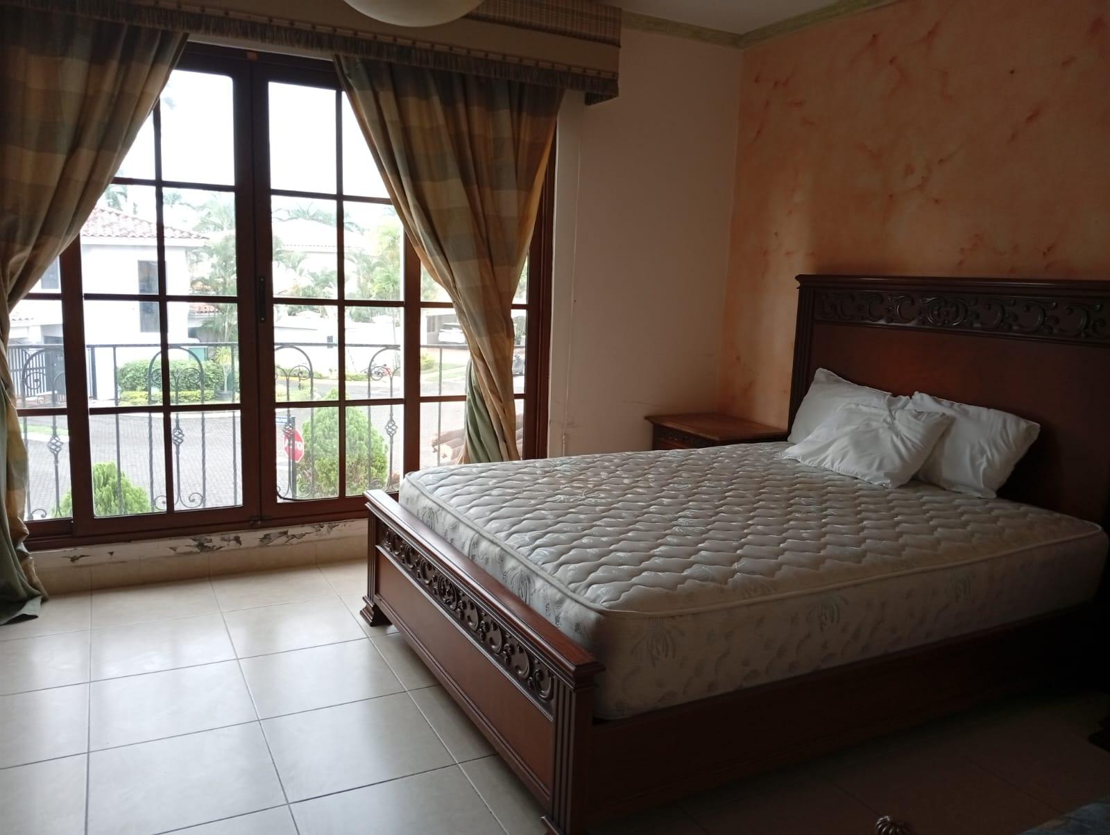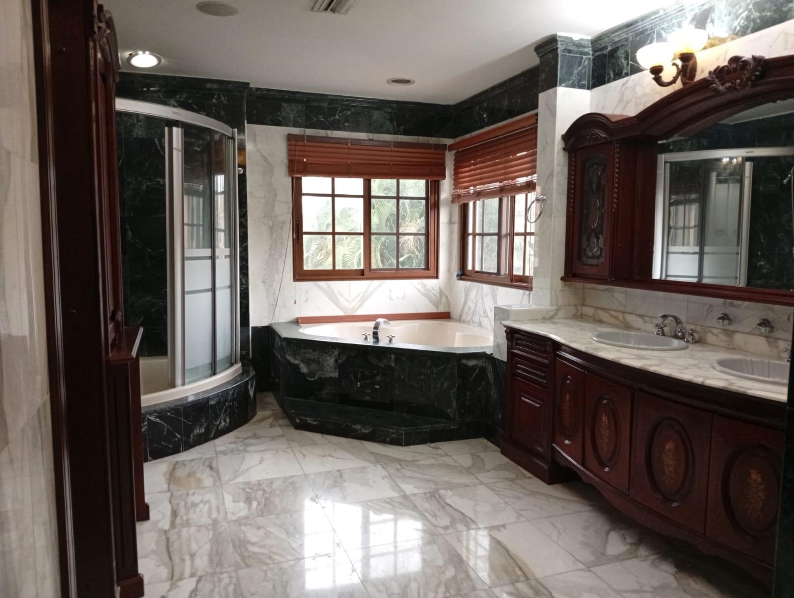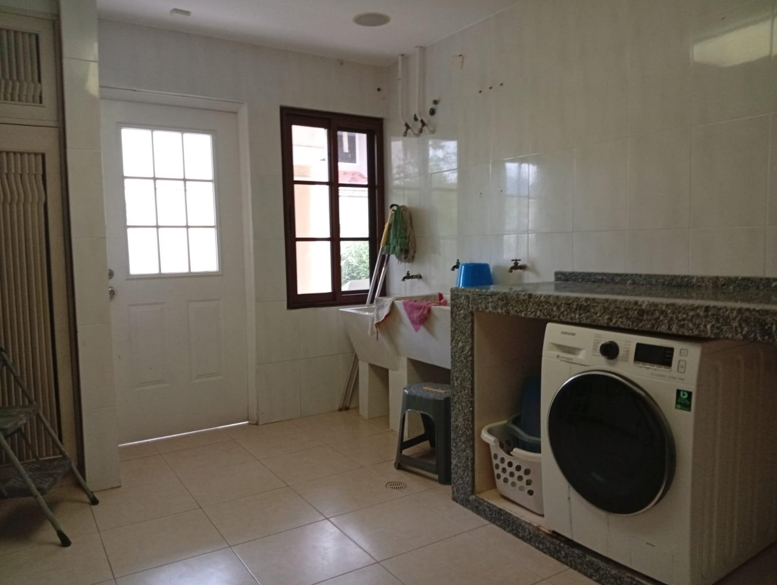 This three-level residence features a living and dining room, a spacious kitchen, a den/bar, a recreation area, five bedrooms, six bathrooms, a jacuzzi, a sauna, storage rooms, and a study. It is the only three-story home in this exclusive gated community. The property includes an indoor pool that requires maintenance. The community also offers a social area with soccer and basketball courts, a swimming pool, and a party area.