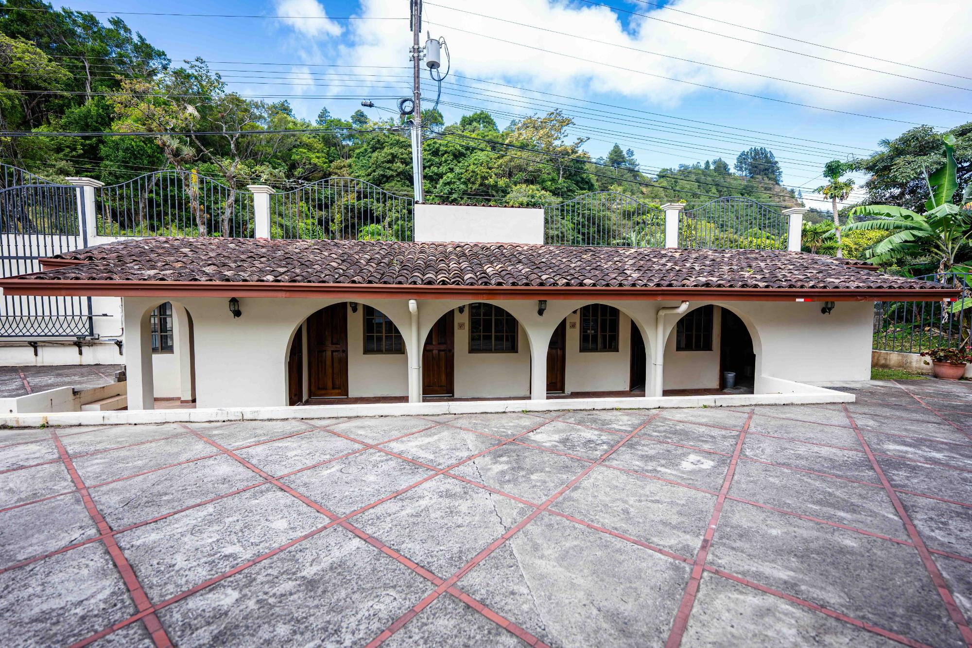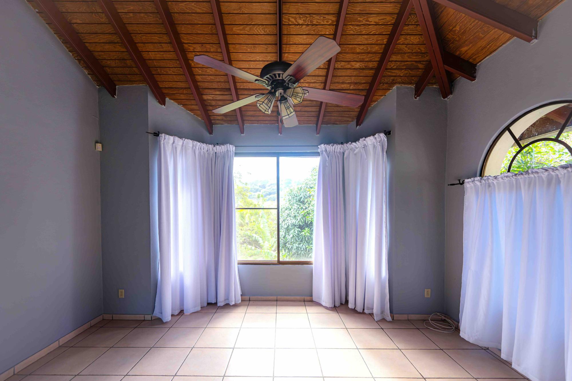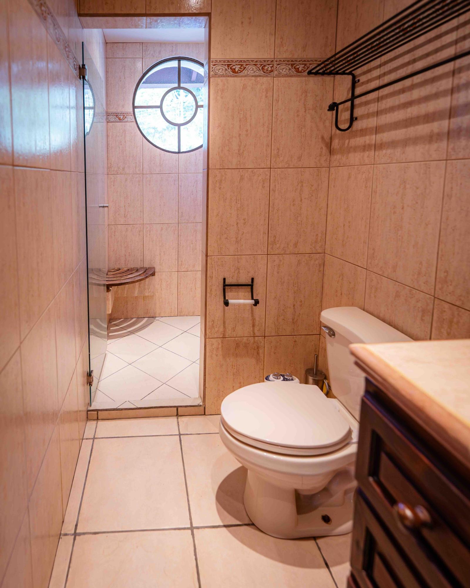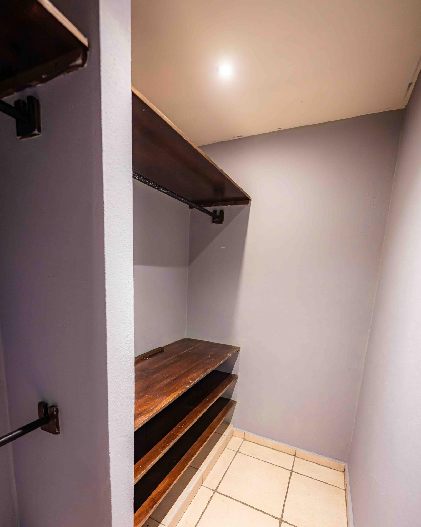 It features two bedrooms, each with its own bathroom and walk-in closet, on the upper floor. Downstairs there is a foyer, a guest bathroom, a closed kitchen, and a living/dining room. Two covered parking spaces are included. A separate storage room is also provided.